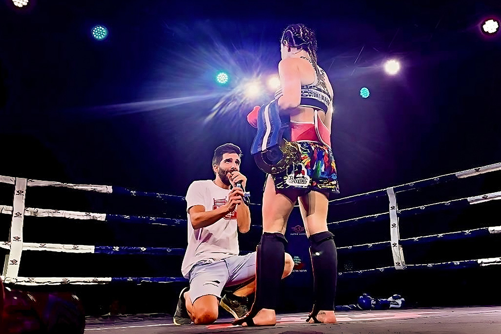 Cabe asimismo referir que el cinturón europeo no llegaba solo aquella inolvidable noche, porque su pareja, Fernando Ramírez, subía al ring para entregarle el anillo de compromiso con el que poder formalizar matrimonialmente la relación que les une hace años.