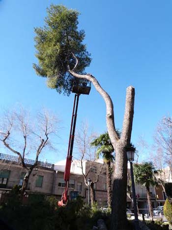 Se ha utilizado una grúa de más de veinte metros para cortar, en primer lugar, las ramas más altas, y después ir desmontando el árbol hacía abajo. El concejal explicaba que, “una vez retirado el pino, en su lugar se plantarán tres nuevos ejemplares con el objetivo de mantener el parterre como una zona tradicional de sombra”.