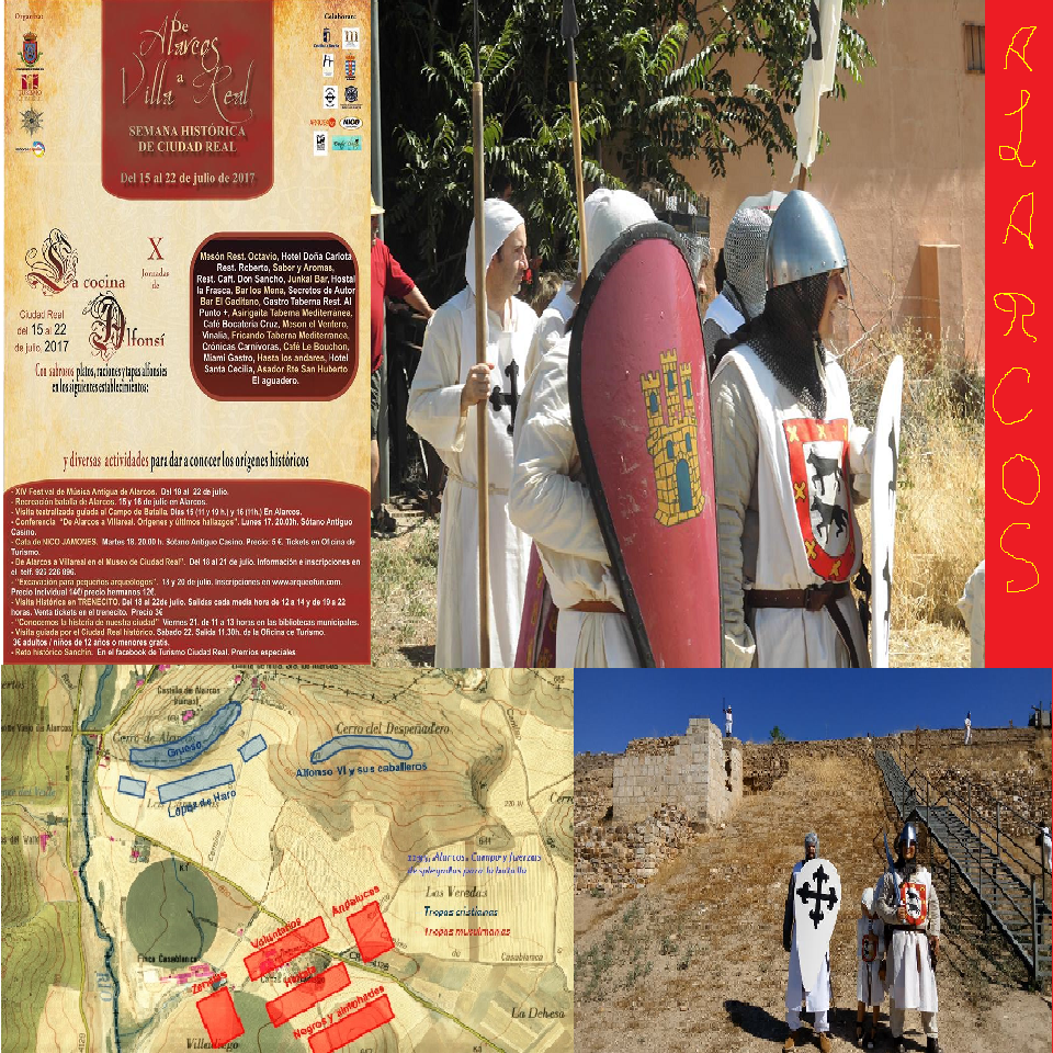 2. De la Batalla de Alarcos, se darán recreaciones históricas de la Asociación de Caballeros y Damas de la Orden de Calatrava, en colaboración con el ayuntamiento de Poblete, y de la Asociación de Recreación Histórica de Ciudad Real 1195 – 1809, mostrando, de esta última, imágenes bajo el título de “Defendiendo a Alfonso VIII y De guardia en el Castillo de Alarcos antes de la batalla” (cedidas por el historiador Antonio José Martín de Consuegra Gómez, miembro de la Asociación referida). También visitas teatralizadas guiadas al Campo de Calatrava y alrededores. Dichas actividades se darán los días 15 y 16 de julio.