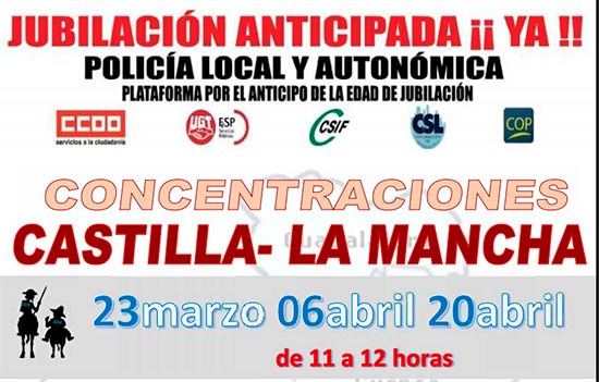 Plataforma por el anticipo de la edad de jubilación.- Los Sindicatos CCOO, CSIF, UGT y SPL CLM (CSL) con representación en las Policías Locales en Castilla-La Mancha, miembros de la Plataforma nacional por el adelanto de la edad de jubilación de las policías locales y autonómicas, junto a COP, han convocado un calendario de movilizaciones por todo el territorio nacional para exigir al Gobierno que finalice de forma inmediata el proceso de aprobación el Real Decreto de adelanto de la edad de jubilación de los policías locales de toda España, actualmente estancado de forma incomprensible en el Ministerio de Hacienda y Función Pública.