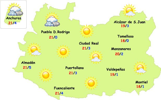 El viento soplará flojo variable por la mañana y con predominio del SW a partir de la tarde, cuando alguna racha moderada se puede dar, sobre todo en los Montes de Toledo. Las temperaturas mínimas podrán subir un poco, mientras que las máximas descenderían cosa de un grado – como mucho dos – que no repercutirá en otro día más que podría pasar perfectamente por ser uno de mayo: