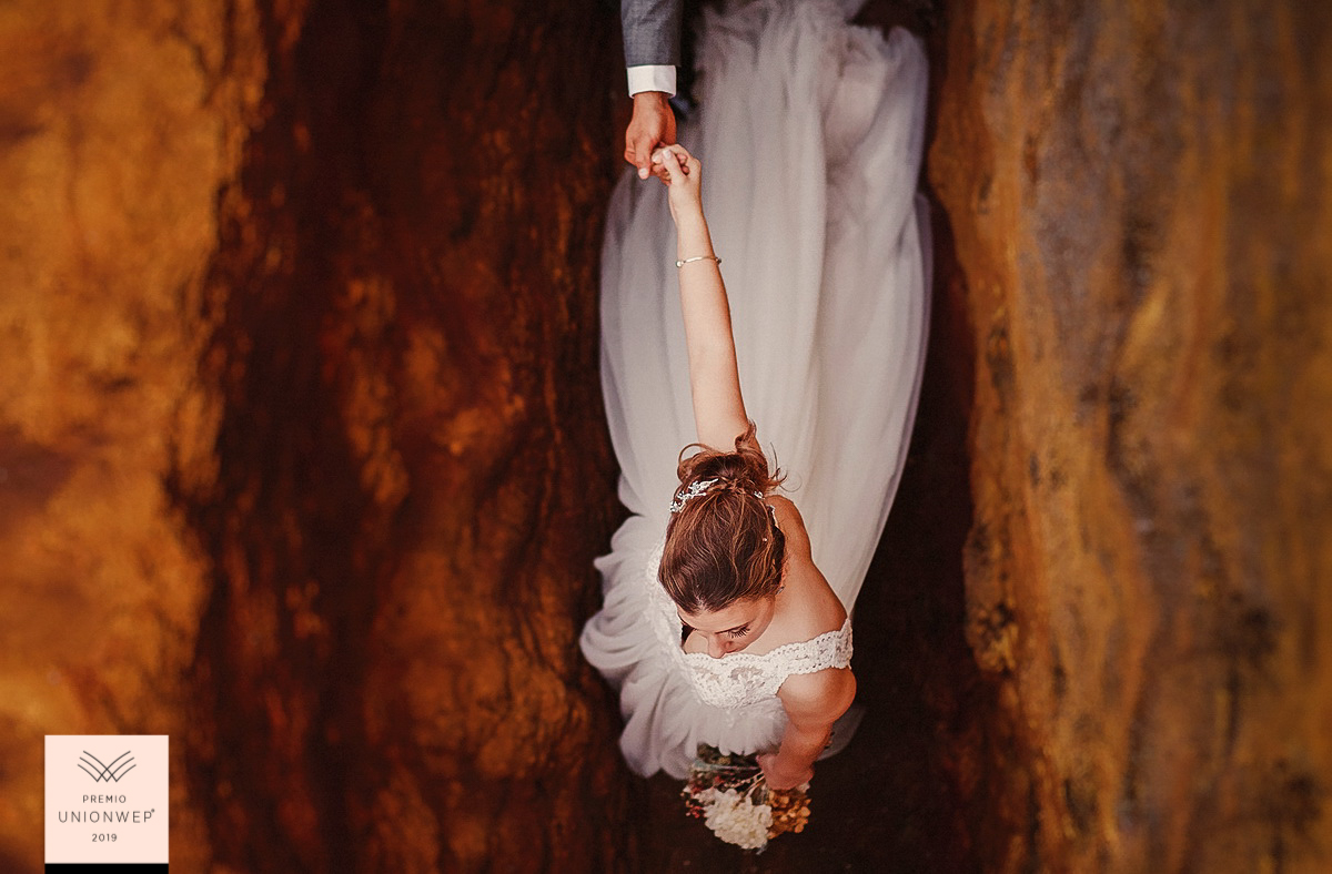 Una de las instantáneas que más ha llamado la atención, y que ilustra esta noticia, corresponde a la sesión “en un maravilloso laberinto que nos ofrecía la posibilidad de hacer volar la imaginación, y nunca mejor dicho, porque pudimos captar un sensacional plano cenital en el que dejamos ver cómo la pareja camina de la mano hacia una nueva vida juntos sin mirar atrás”, comenta Naranjo. La fuerza de la fotografía, prosigue, está en esas manos entrelazadas y en cómo la novia quiere al novio –que está fuera de plano- a su lado.