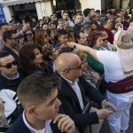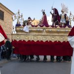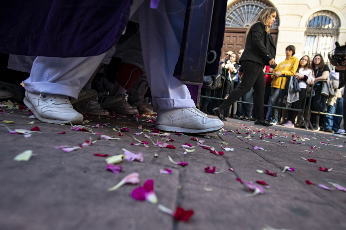 La Parroquia de Santa María del Prado (La Merced) abría sus puertas a las seis de esta tarde y desde allí iniciaba su estación de penitencia la Hermandad del Santísimo Cristo ultrajado y coronado de espinas y Santa María del Perdón. El paso de palio era recibido a su salida por una lluvia de pétalos.