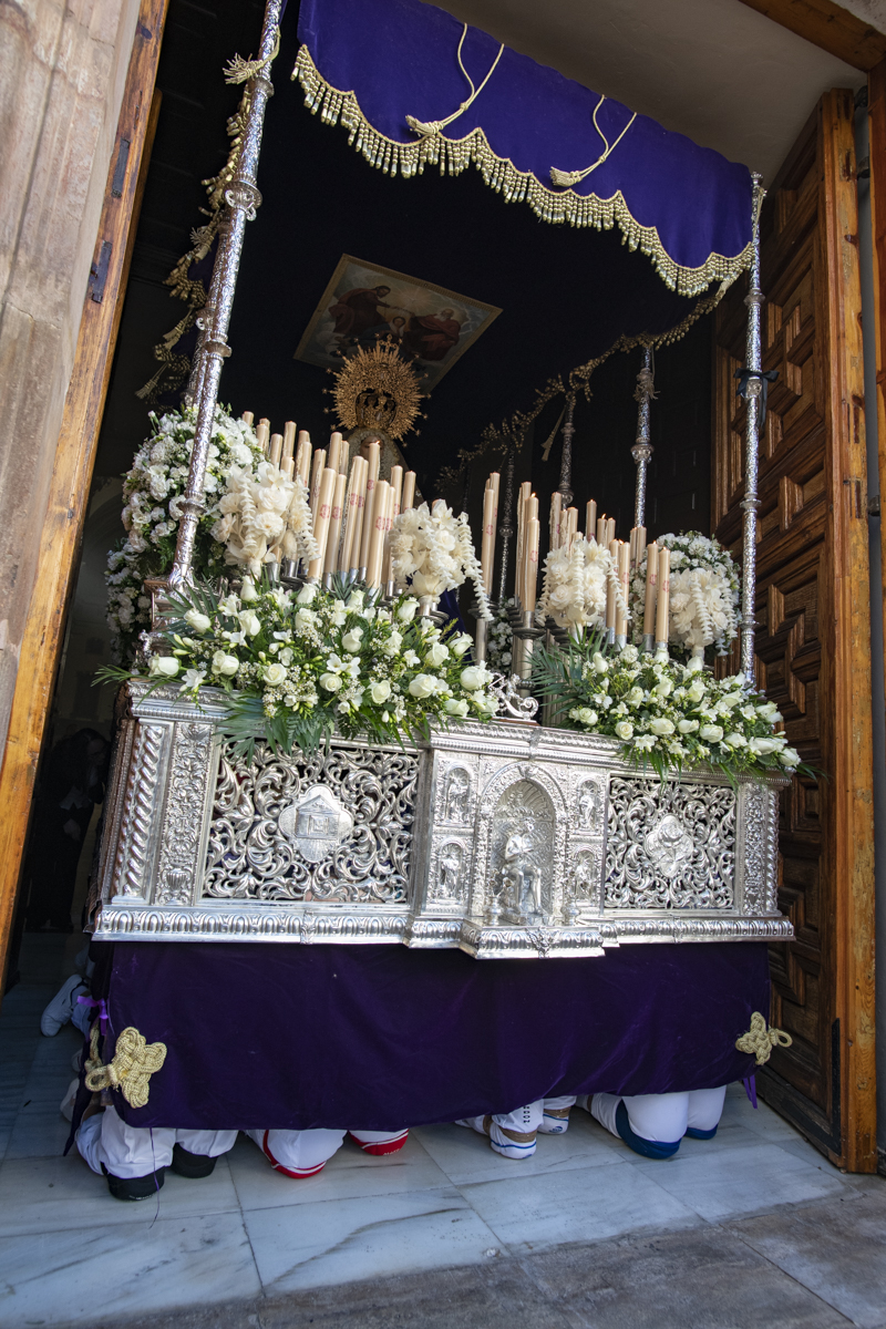 El paso del palio tiene orfebrería en metal plateado, con respiraderos, peana, jarra, varales y candelería. El palio es de terciopelo color morado. La gloria del techo representa la coronación de María Santísima. Los faldones son de color morado llevando en el delantero el escudo de la hermandad.