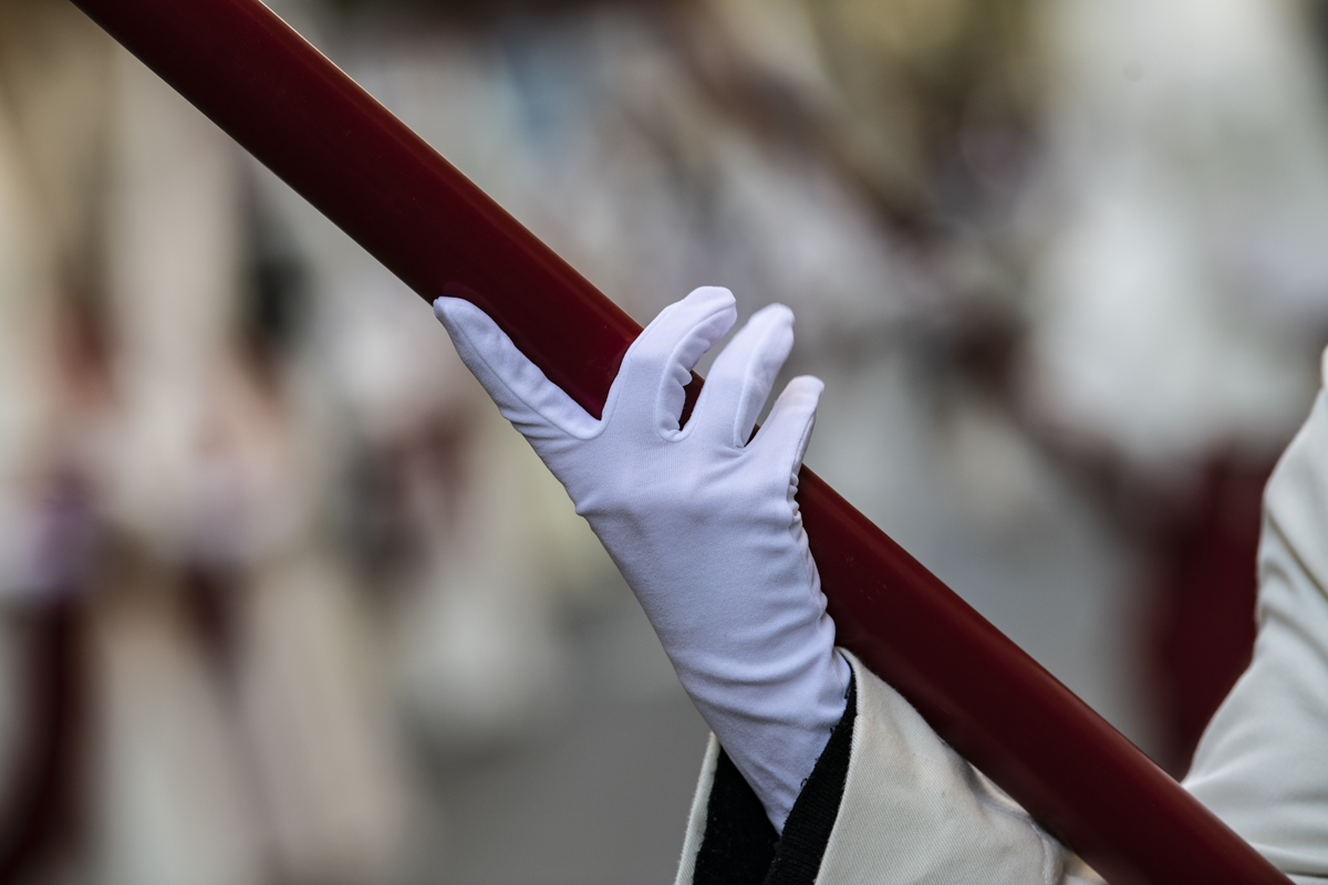 La túnica de los nazarenos es blanca con fajín y clámide de color púrpura, el capillo también blanco. Sandalias negras y calcetas blancas. Portan cirio de color granate en el misterio y blancos en el palio. La hermandad se constituyó el 1 de mayo de 1992 por un grupo de catequistas de la Parroquia de Santa María del Prado.