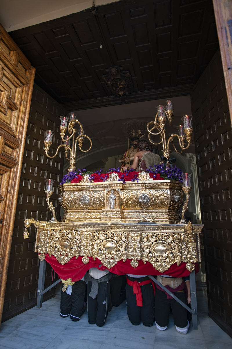 Todas las Imágenes que posee esta Hermandad son obras del sevillano Jesús Méndez Lastrucci que las talló en 1997. La imagen del Señor es de talla completa. Porta una clámide de terciopelo rojo, las manos atadas y una caña entre ellas. El resto de las figuras del misterio son de vestir con orfebreria en los romanos de Manuel de los Ríos (1997). El paso del misterio es de estilo barroco. Lleva candelabros de guardabrisas, faldones granates y orfebrería dorada. Fue estrenado en el año 2003. La virgen viste saya en terciopelo morada bordada en oro. Luce corona en metal sobredorado y en su pecherín lleva clavado un puñal. El manto es listo, de terciopelo morado.