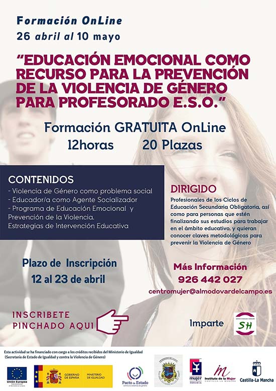 Ayuntamiento de Almodóvar del Campo, Centro de la Mujer y Centro de Psicología y Formación SH contribuyen a organizar el taller online gratuito ‘Educación emocional como recurso para la prevención de la Violencia de Género para profesorado E.S.O.’.