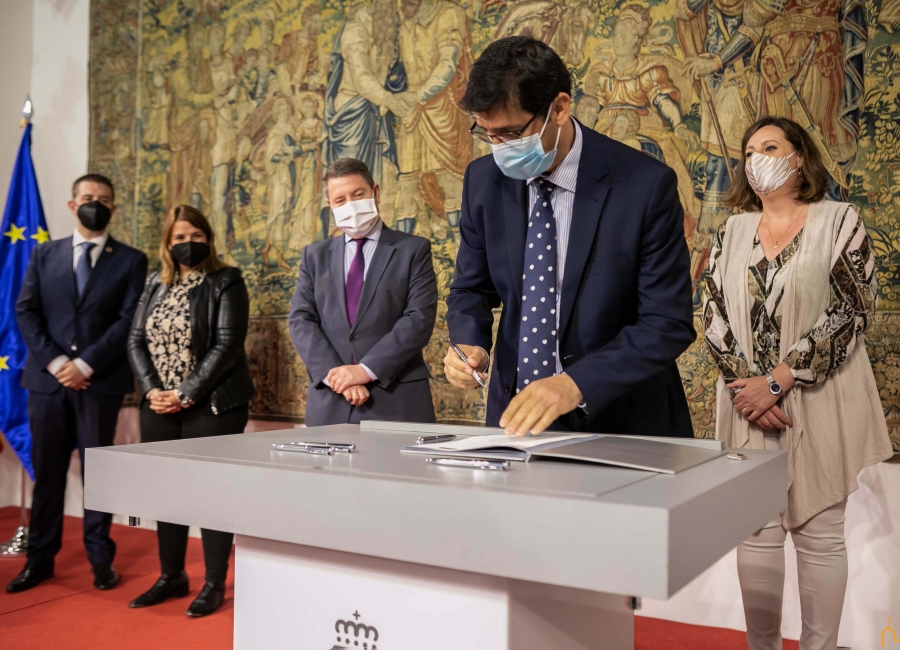 El presidente de la Diputación de Ciudad Real, José Manuel Caballero, ha firmado esta mañana, junto al presidente del Gobierno regional, Emiliano García Page, la consejera de Economía, Patricia Franco y el resto de presidentes de diputaciones de Castilla-La Mancha, el convenio del nuevo plan de empleo de la Junta de Comunidades, que en esta edición cuenta con una inversión total en la provincia de 35 millones de euros.