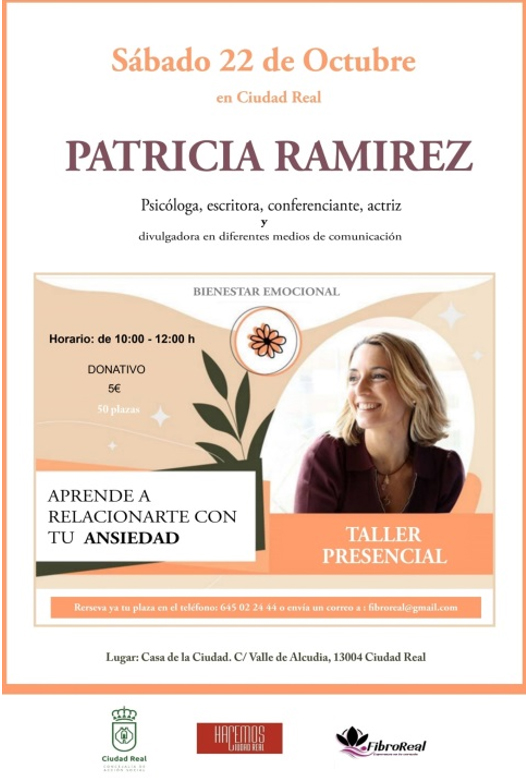 Comunicado.- La asociación FibroReal con la colaboración de la Concejalía de Bienestar Social y la Concejalía de Participación Ciudadana de Ciudad Real realizará el taller presencial “Aprende a relacionarte con tu ANSIEDAD”, impartido la reputada Psicóloga Clínica Patricia Ramirez.