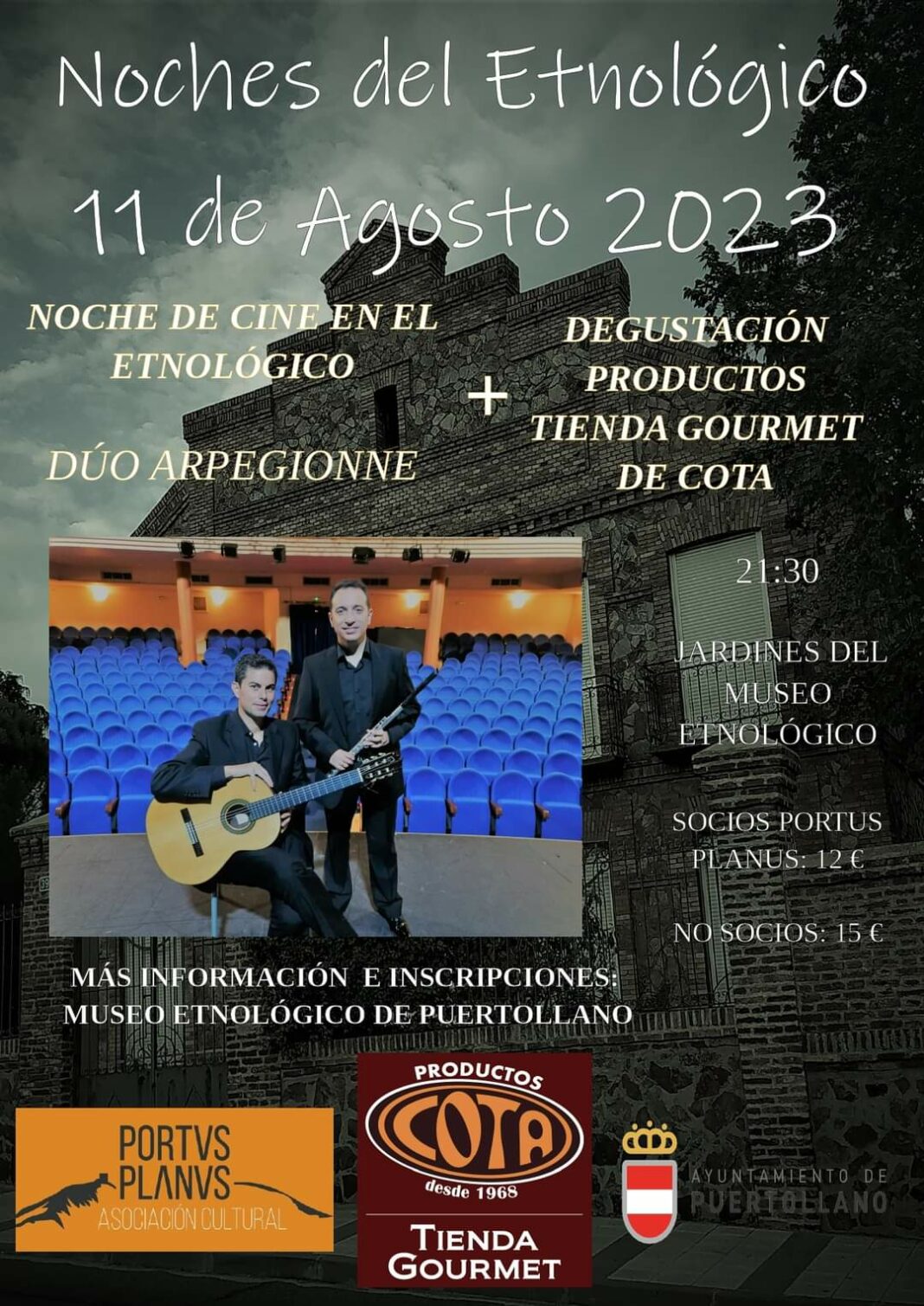 Dentro del programa ´Noches del Etnológico´, la Asociación Cultural Portus Planus organiza para este próximo viernes día 11 de agosto, a partir de las 21,30 horas, una noche de cine con un concierto del Dúo Arpegionne y la degustación de productos gourmet de Cota. Los precios serán de 12 euros para los socios y 15 para los no socios. Más información e inscripciones en el Museo Etnológico de Puertollano.