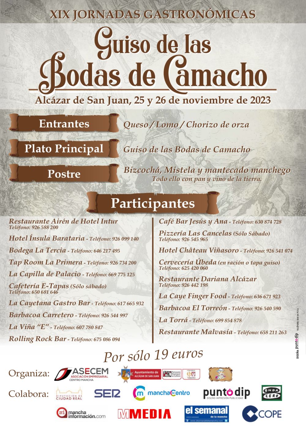 Durante los días 25 y 26 de noviembre, último fin de semana del mes, los principales establecimientos hosteleros de la localidad servirán el menú del Guiso de Bodas, permitiendo tanto a la ciudadanía alcazareña como a los visitantes de la ciudad disfrutar de una experiencia gastronómica quijotesca: «Alcázar es referente gastronómico en esta comarca y en esta provincia. Nunca debemos perder nuestra esencia y nuestras raíces. Por ello, las jornadas del Guiso de Bodas de Camacho son tan importantes, porque muestran la tradición y la buena mesa de nuestra ciudad», señalaba Miguel Ángel Martínez, vicepresidente de ASECEM.