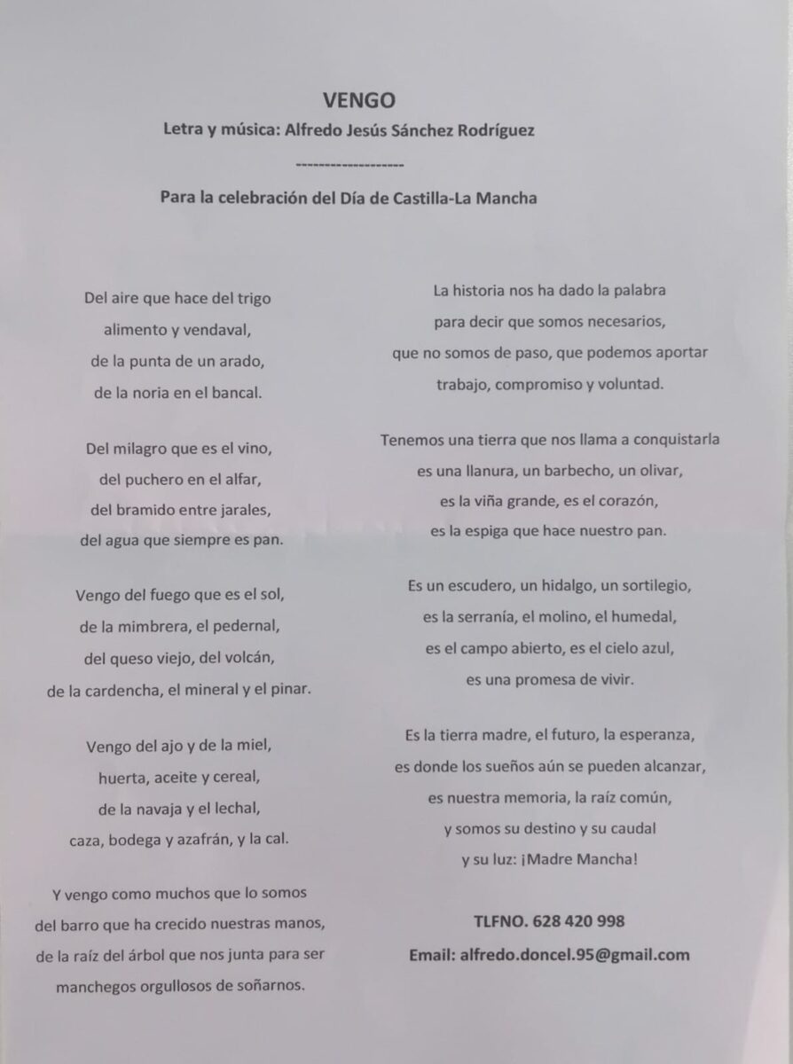 Castilla La ManchaCiudad Real ‘Vengo’, el himno a Castilla-La Mancha compuesto por Alfredo Sánchez Rodríguez miciudadreal 31 mayo, 2024 1 495 views Cuota FacebookTwitterWhatsAppEmailImpresiónTelegramCopy URL El compositor Alfredo Sánchez Rodríguez presenta ‘Vengo’, un himno a Castilla-La Mancha. Cuota FacebookTwitterWhatsAppEmailImpresiónTelegramCopy URL Artículo anterior¡No hay mejor defensa que un buen ataque!Artículo siguienteEl monumento al minero de Puertollano se teñirá de verde para dar visibilidad a las personas afectadas de Miastenia Relacionados 1 COMENTARIO Yo no lo veo fácil de aprender y bastante rancio. Comentario ESCRIBE UN COMENTARIO Cancelar comentario Comentario: Por favor ingrese su comentario! Nombre:* Por favor ingrese su nombre aquí Correo electrónico:* ¡Has introducido una dirección de correo electrónico incorrecta! Por favor ingrese su dirección de correo electrónico aquí Sitio web: Guardar mi nombre, correo electrónico y sitio web en este navegador la próxima vez que comente.