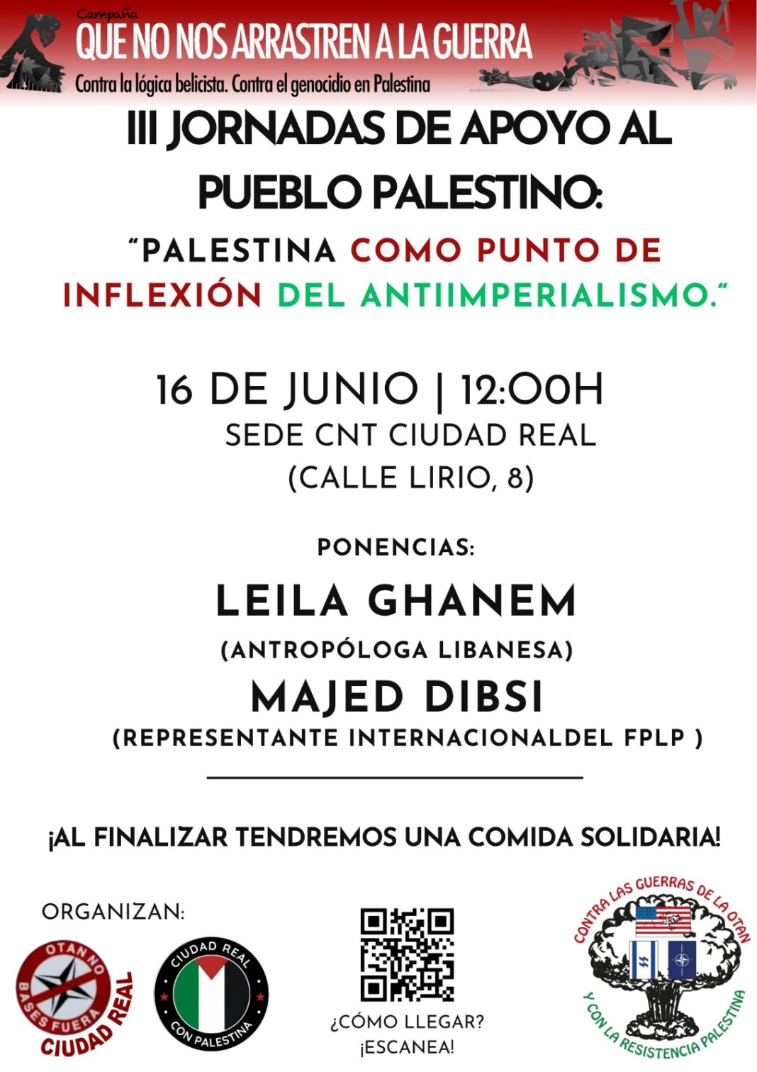 Comunicado.- Desde la Asamblea Ciudad Real con Palestina y la plataforma OTAN NO Bases Fuera, organizamos este domingo 16 de junio a las 12:00h nuestras III Jornadas abiertas para seguir divulgando y aprendiendo acerca del genocidio que el ente sionista está ejerciendo sobre el pueblo palestino. Estas jornadas tendrán lugar en la sede de la CNT (Calle Lirio, 8) en Ciudad Real.
