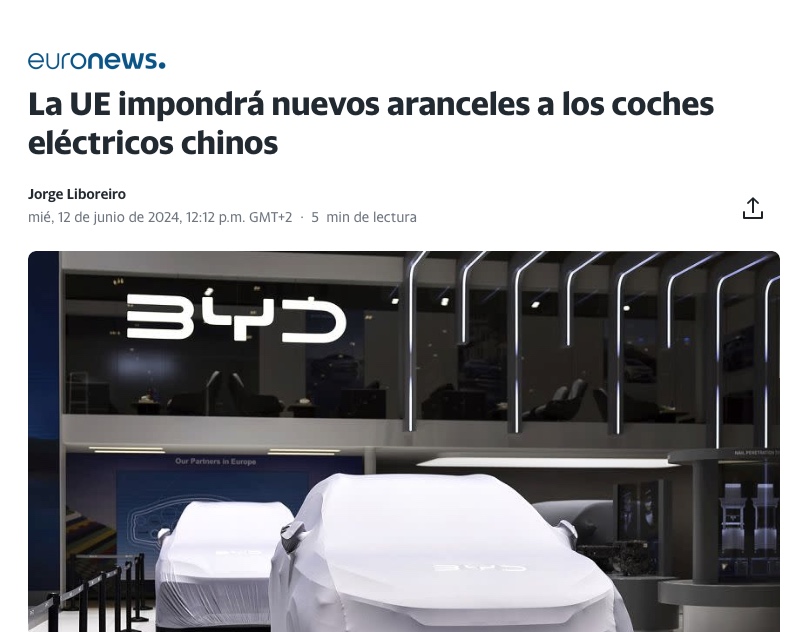 La respuesta de ha sido el impulso de aranceles, en EEUU de un 100% y en el U.E. algo menos, pero todo indica que Irán subiendo a medida que vayan bajando los precios de estos vehículos.