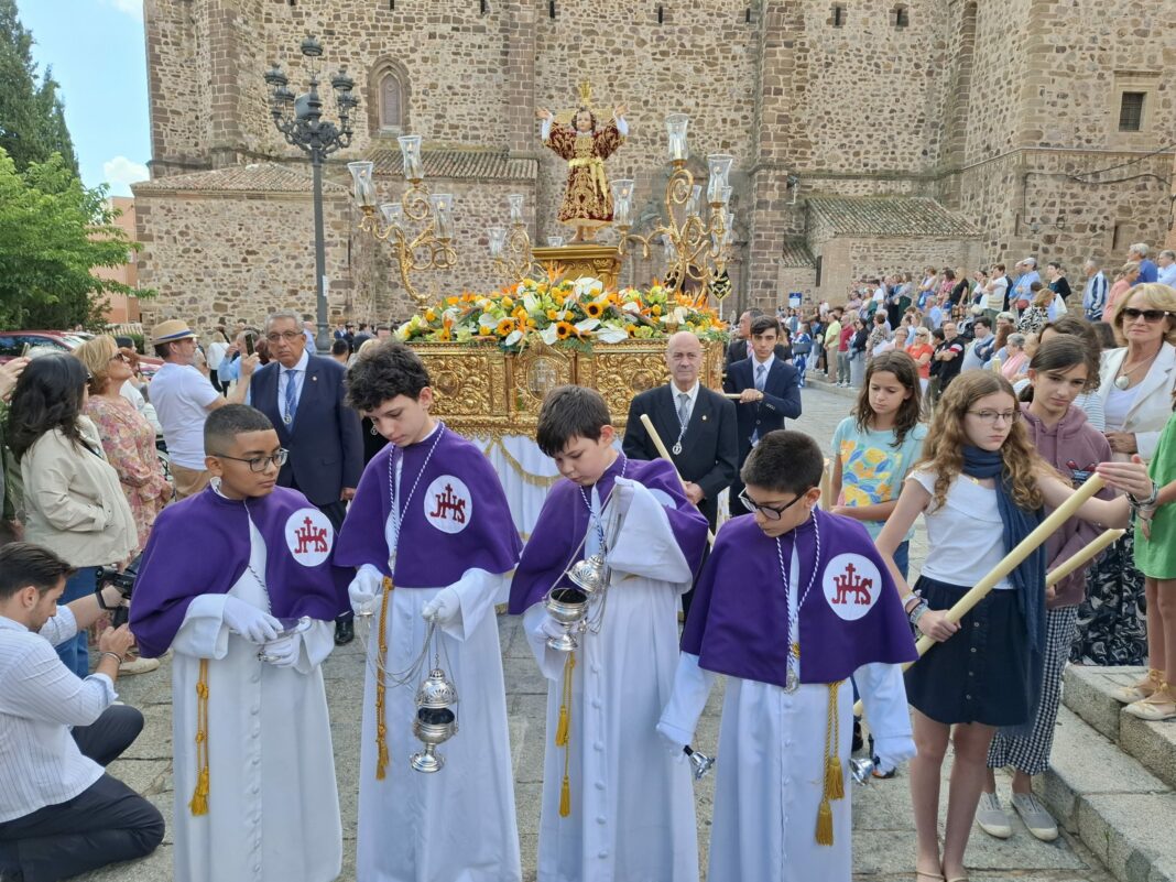 Desde la parroquia de Nuestra Señora de la Asunción a las doce y media iniciaba su itinerario el Niño Jesús con el estreno de la túnica del 75 aniversario elaborada por Manuela Jiménez Castellanos y con un trono decorado por Floristería de Antonio Díaz con diversos elementos florales para dar mayor luminosidad a la imagen con girasol, anthurium blanco, strelitzia reginae (ave del paraíso) rosas amarillas, orquidea verde cymbidium.