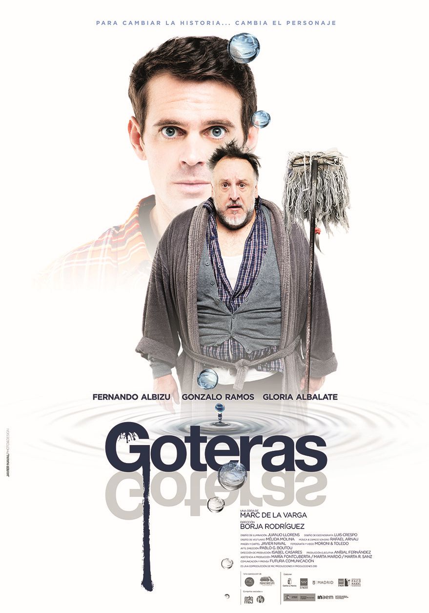 Goteras nos cuenta la historia de Toni, un joven dramaturgo (Gonzalo Ramos) con un futuro prometedor. Una noche cualquiera, aparecen unas goteras en su techo. Lo que debería ser un simple accidente doméstico, se acaba transformando en el momento más importante de su vida, cuando descubre que su vecino de arriba (Fernando Albizu) es él mismo 30 años más tarde. Además, cuenta con la participación en escenario de la manchega Gloria Albalate.