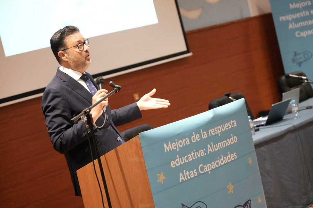 El consejero de Educación también se ha referido al proyecto piloto para la mejora de la respuesta educativa al alumnado con altas capacidades, que hoy se clausuraba en esta jornada formativa y que es el marco en que está enclavada la guía. En este sentido, ha explicado que, durante tres cursos escolares, han participado 82 centros educativos de la región y un total de 3.814 alumnos y alumnas.