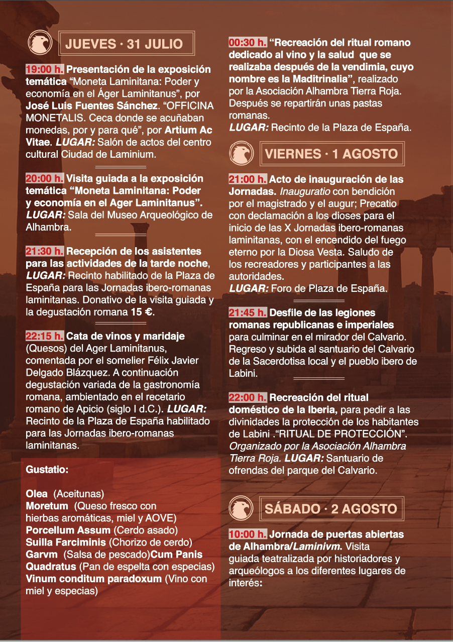 El municipio de Alhambra, en la provincia de Ciudad Real, vuelve a rememorar su pasado, concretamente la época ibero-romana, etapa en la que Laminium -la actual Alhambra- se consolidó como una de las ciudades más importantes de la Meseta sur de la Hispania romana, al ser un importante cruce de caminos y el mayor exportador de piedras de afilar. Para ello, esta localidad celebra la X edición de las Jornadas ibero-romanas laminitanas, que se desarrollarán los días 31 de julio, 1, 2 y 3 de agosto, en las que vecinos y visitantes podrán disfrutar de un amplio elenco de actividades culturales tales como recreaciones históricas, conferencias, talleres, degustaciones gastronómicas de la época, visitas guiadas por el patrimonio arqueológico, ente otras actividades.