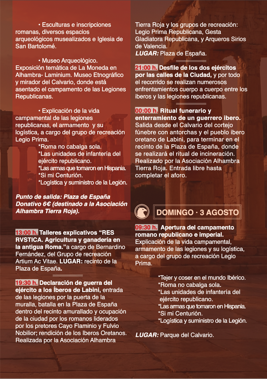 El público podrá disfrutar de diferentes recreaciones históricas, como la batalla y toma de la ciudad, el ritual funerario de un guerrero íbero, una ceremonia de protección ibérica, lucha de gladiadores o varios rituales religioso romanos. Además, se conocerán algunos aspectos de las culturas ibéricas y romanas a través de una serie de talleres impartidas por historiadores, que culminará con una degustación gastronómica romana. Igualmente, y como parte fundamental de estas jornadas, habrá una visita guiada por el interesante patrimonio arqueológico de esta población: Museo Arqueológico Municipal, togados e inscripciones romanas, Iglesia de San Bartolomé u otros yacimientos musealizados, que ofrecen al visitante una riqueza cultural al alcance de pocos sitios. En esta misma visita, habrá talleres de arqueología experimental y recreación histórica impartidos por los grupos de recreación histórica.