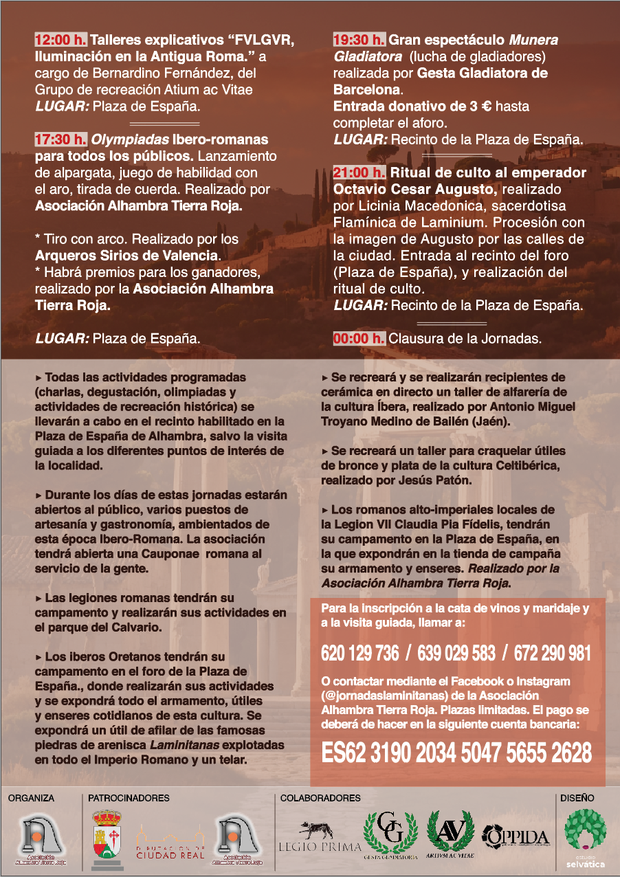 Las jornadas son organizadas por la Asociación Alhambra Tierra Roja, agrupación cultural formada por vecinos de esta población que trabaja para la protección, conservación, puesta en valor y divulgación del patrimonio histórico y arqueológico de Alhambra. Se cuenta con el patrocinio de la propia Asociación, el Ayuntamiento de Alhambra y la Diputación de Ciudad Real, así como diversas empresas y negocios del municipio y el entorno. Para la realización de las actividades, se cuenta con la colaboración de los grupos de recreación histórica Gesta Gladiatoria, Legio Prima, Artium Ac Vitae, venidos de varios puntos del país, así como con la colaboración de la empresa de arqueología Oppida.