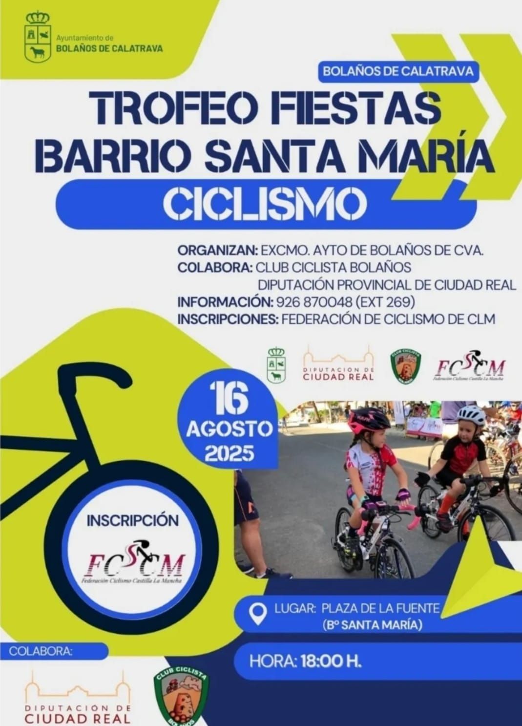 El día 16 de agosto, el Barrio de Santa María de Bolaños de Calatrava será escenario de una emocionante jornada deportiva con la celebración del Trofeo de Ciclismo ‘Fiestas Barrio Santa María’, una prueba de ciclismo de categoría escuelas que reunirá a jóvenes ciclistas llegados de toda la región.