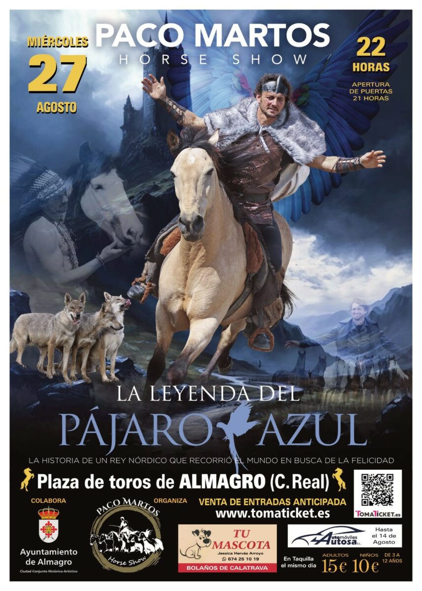 La Plaza de Toros de Almagro acogerá el próximo 27 de agosto el espectáculo ecuestre de Paco Martos ‘La leyenda del pájaro azul’. La historia de un rey nórdico que recorrió el mundo en busca de la felicidad. Las entradas pueden adquirirse en venta anticipada en www.tomaticket.es