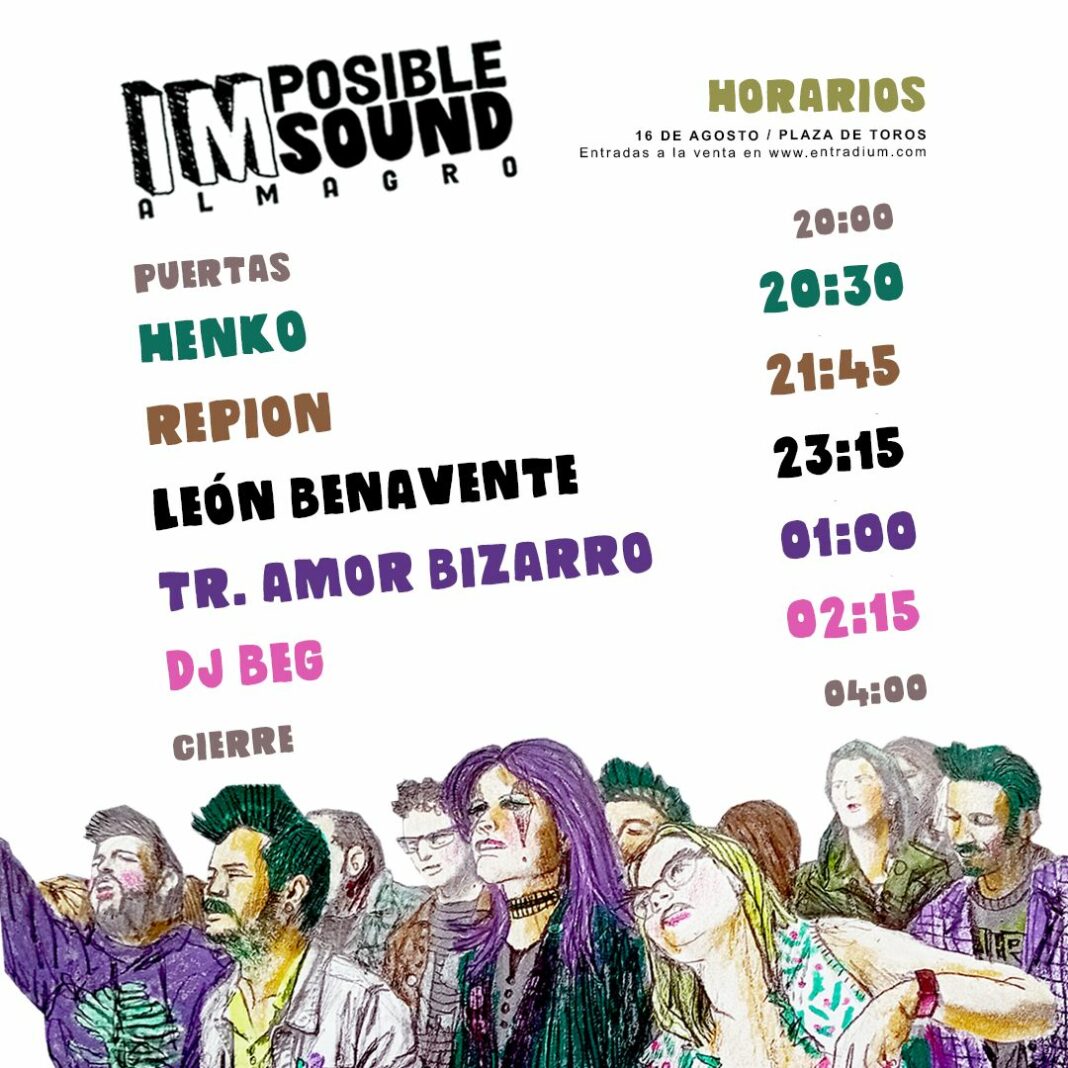 El próximo 16 de agosto Almagro abrirá su Plaza de Toros para disfrutar de las bandas más potentes del panorama independiente. Imposible Sound promete una experiencia inolvidable con un cartel diverso que incluye a artistas de renombre nacional como LEON BENAVENTE o TRIÁNGULO DE AMOR BIZARRO, la fuerza emergente de REPION y por supuesto sigue manteniendo su apuesta por el talento local con HENKO, acabando esta edición con una sesión DJ a los mandos de DJ BEG, artista almagreña con más de 20 años de experiencia con platos y vinilos.