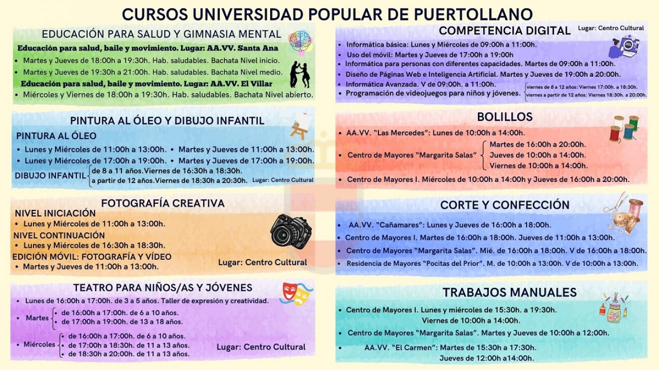 La Universidad Popular ofertará el próximo curso académico cursos de “Educación para salud y gimnasia mental” en las barriadas Santa Ana y El Villar; pintura al óleo y dibujo infantil; fotografía creativa (iniciación, continuación y edición móvil-fotografía y vídeo) y teatro para niños y jóvenes de 3 a 18 años.