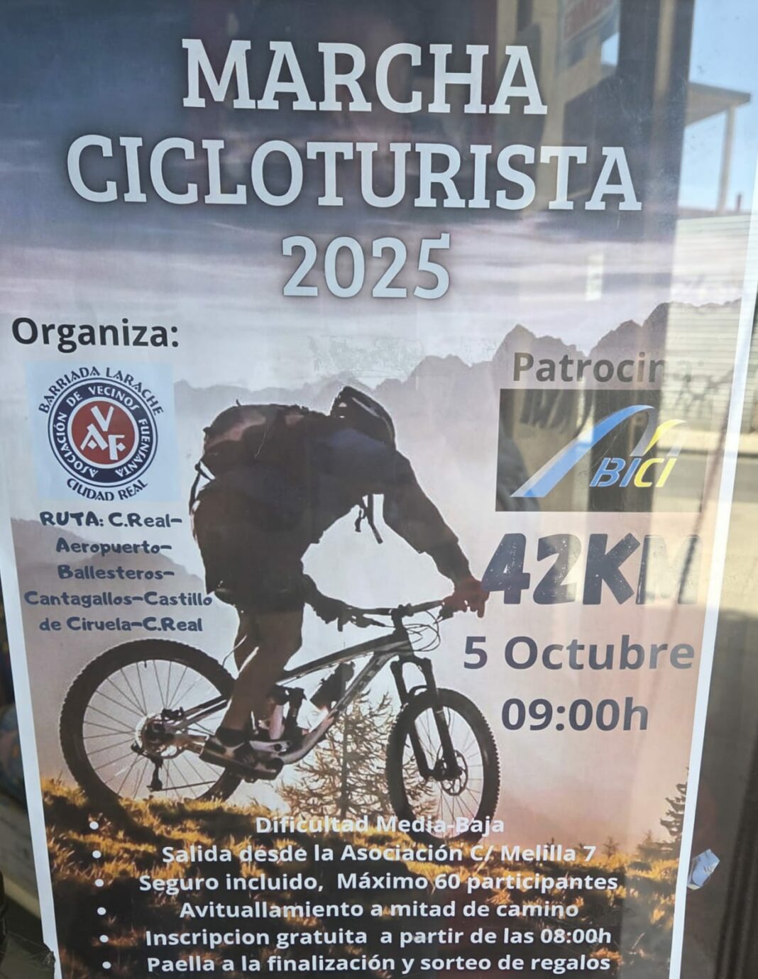 Anselmo Alañón Alcaide.-El próximo 5 de octubre tendrá lugar en Ciudad Real una Marcha Cicloturista que dará comienzo a las 9.00 horas, con un recorrido de 42 kilómetros. La salida se efectuará en la calle Melilla, 7 de Ciudad Real. Esta marcha será organizada por la Asociación de vecinos de la Barriada del Larache.