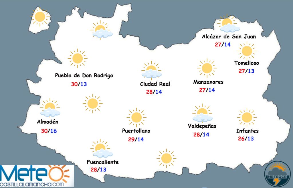 El viento soplará flojo variable, con cierto predominio del E/NE a primeras horas. Las temperaturas mínimas podrán bajar algún grado y las máximas se mantendrán sin cambios salvo en La Mancha, donde podrían descender también ligeramente. En puntos del oeste y centro de la provincia podremos volver a rondar esos 30ºC:
