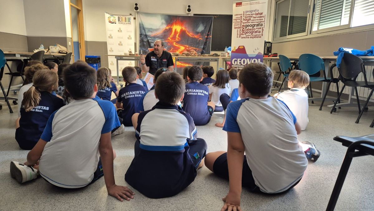 La primera de las actividades tuvo lugar en el Colegio Marianistas de Ciudad Real, donde más de 150 alumnos y alumnas de 3º y 4º de Educación Primaria participaron en un geotaller de volcanes. Coordinada por el profesor de Geografía Física de la UCLM, Rafael Ubaldo Gosálvez, y con la colaboración de Beatriz Morales, educadora ambiental, la experiencia convirtió el centro educativo en un auténtico laboratorio de Ciencias de la Tierra.