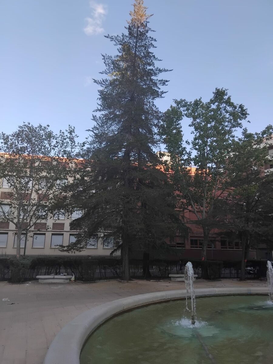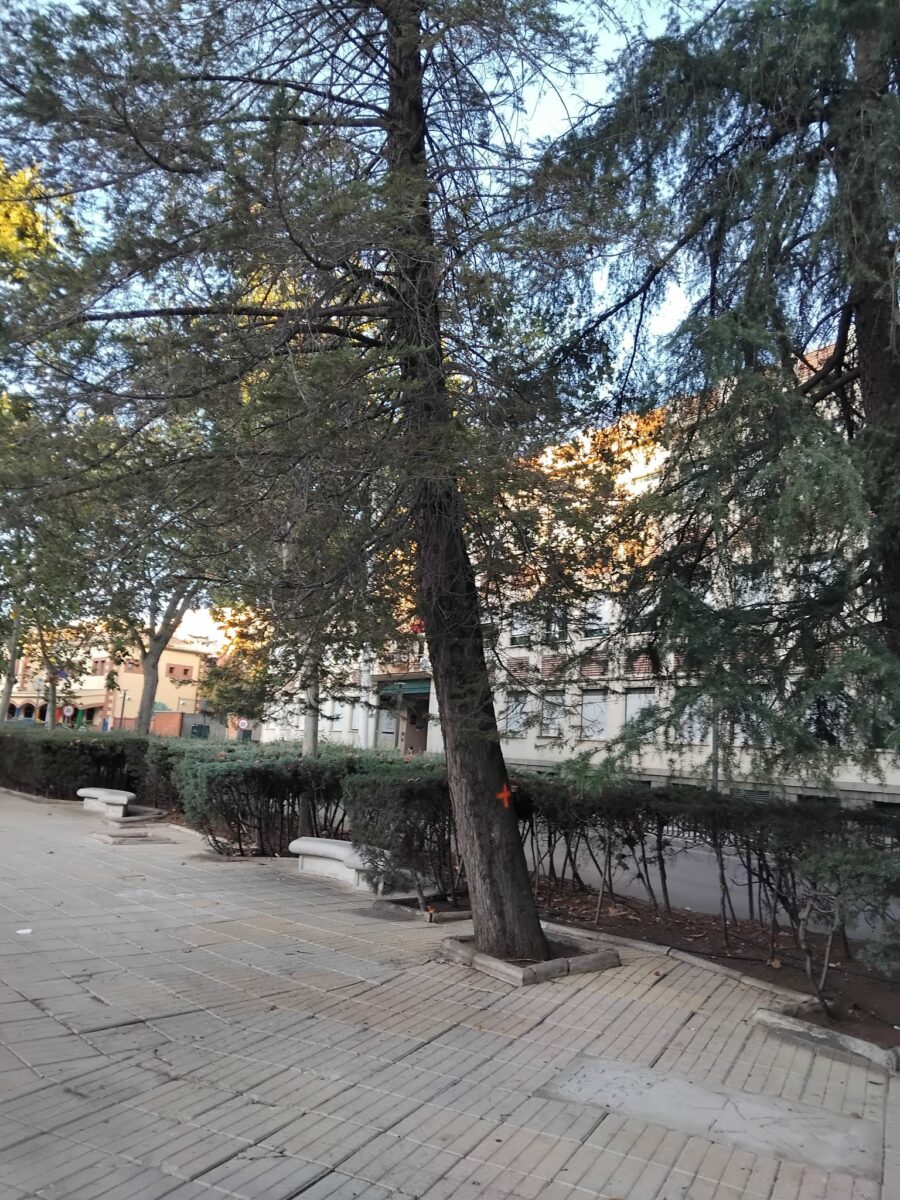 Es uno de los últimos supervivientes de aquella plaza de la Virgen de Gracia de los años 70, aún separada del Paseo del Bosque de Puertollano por una calzada de adoquines aplastados por camiones tan grandes como dragones y tractores tan lentos como dinosaurios. El cedro nació en una isleta con pose de guardia de la porra, y acabó orillado como un árbol de égloga junto a la fuente del obelisco. Seguro que podría recordar a los niños de la Transición que se encaramaban jugando al Monumento a los Caídos, lanzándose la pelota en la diáfana explanada, o el bullicio de la chavalería de Maestría al salir de los talleres. Aquel cedrito joven que aparece a la derecha de la magnífica foto de Sánchez es ahora uno de los abuelos arbóreos de Puertollano, aunque tristemente marcado por la pintura de sangre que le condena a la desaparición o a un trasplante de incierto resultado ante las inminentes obras. Se va el cedro que nos ha visto vivir y morir, al que hemos visto nosotros mismos, viviendo y muriendo.