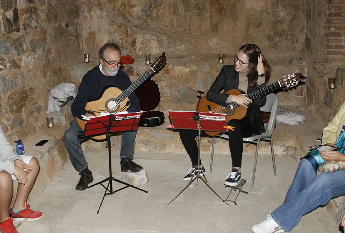 El cementerio, conocido como el Campo de los Mártires, es un lugar cargado de simbolismo. En su interior se encuentra la capilla de la Virgen de los Mártires, dedicada a la patrona de la Orden de Calatrava. Para José Luis Naranjo, promotor del evento, es “un rincón que transmite paz. Te sientas ahí a escuchar las dos guitarras del Dúo Contrastes y las guitarras te enamoran en ese lugar”. El dúo de guitarras ‘Contrastes’, es un tándem formado por Miguel Herreros y Celia González de la Aleja, donde experiencia y frescura se unen para interpretar un repertorio extenso con una amplia variedad de composiciones con las que disfrutaron todos los visitantes que se acercaron a la capilla.