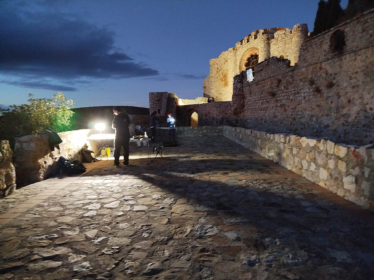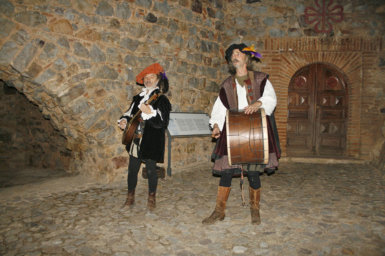 El patio de armas es la primera zona de acceso que nos encontramos en la subida al castillo, se accede a ella desde una bóveda empedrada con arcos ovalados, allí encontraremos una escalera de caracol que da acceso a la biblioteca y las escaleras por las que se puede seguir subiendo al castillo. Allí tuvo lugar la animación teatralizada con historias y música a cargo de los Trovadores de Calatrava, toda una alegría para el alma que la reverberación del patio potenciaba y “donde la gente que se colocaba debajo de los arcos y la gente que se subía a la escalera, y los veía desde arriba, disfrutaron interactuando con ellos”, puntualizaba Naranjo.
