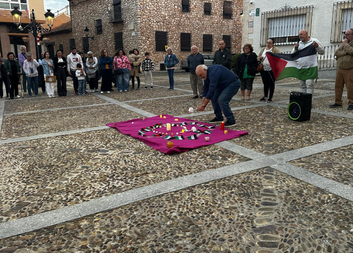 Plataforma Villarta por la Paz.- 9.30 horas. Once de octubre de 2025. Plaza de La Paz. Villarta de San Juan. En círculo, cincuenta y tantas personas, algunas de la comunidad musulmana local. En el centro, un paño magenta soporta velas encendidas arropadas por banderas palestinas. En el aíre se disuelven los últimos acordes y cantos de la polkilla dedicada a la Flotilla de la Libertad cuando, Aitana, de catorce años, ante la cuatricolor del Estado palestino, lee unas líneas. En ellas el recuerdo y la repulsa al secuestro, el 7 de octubre de 2023, por Hamás, de treinta y seis niños israelitas. En ellas, sobre todo el horror sentido ante el asesinato, en la franja de Gaza, de más de 20.000 niños por las acciones -balas, bombas e inanición- planificadas y ejecutadas, desde hace dos años, por el ejército israelí. Y dos deseos: se haga realidad el final del genocidio anunciado y el regreso de nuestra compatriota Reyes Rigo.
