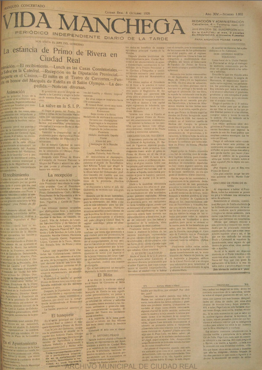 El prólogo al paseo sugerente por Ciudad Real terminaba rememorando la única visita que realizó el dictador a Ciudad Real, en octubre de 1926. Primo de Rivera fue recibido en el Ayuntamiento y la Diputación Provincial, y visitó la Catedral y el Antiguo Casino. La jornada concluyó con un acto de masas en el Teatro Cervantes y una fiesta en el Salón Olympia.