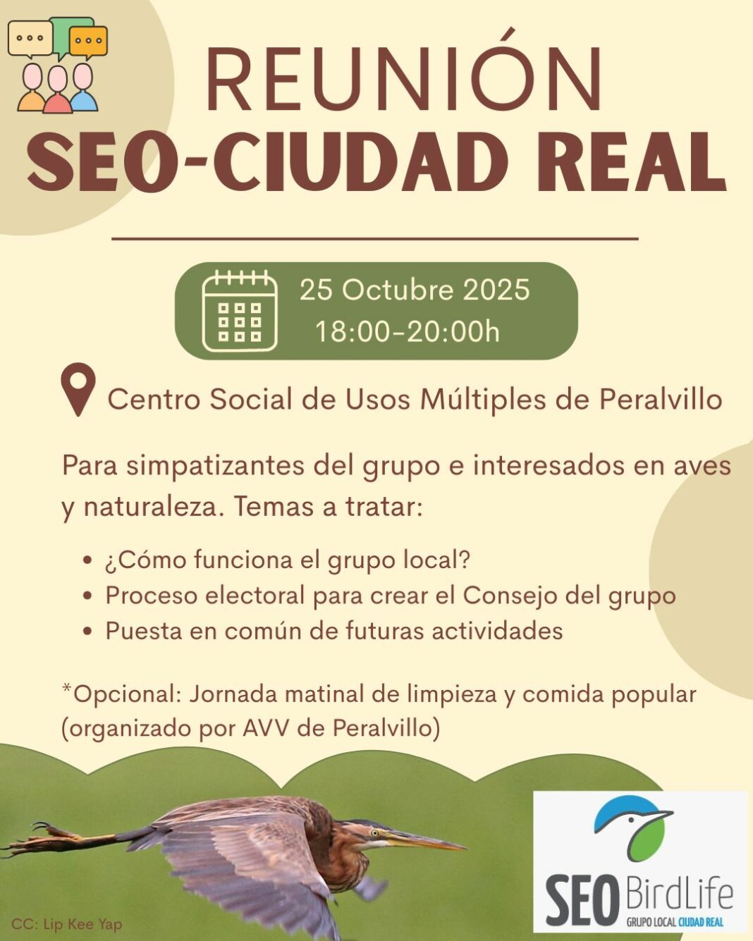 Comunicado.- El grupo local de SEO/BirdLife, SEO-Ciudad Real convoca a tod@s l@s soci@s y simpatizantes a una reunión el próximo sábado 25 de octubre de 2025 de 18:00 a 20:00h en el Centro Social de Usos Múltiples de Peralvillo ( https://shorturl.at/S1hFb ).