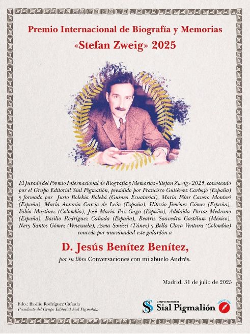 Se ha presentado en la sede de la Editorial Sial Pigmalión, en calle Huesca, número 7 de Madrid, el libro CONVERSACIONES CON MI ABUELO ANDRÉS, de Jesús Benítez Benítez, Premio Internacional de Biografía y Memorias «Stefan Zweig» 2025, que le fue entregado durante el acto.