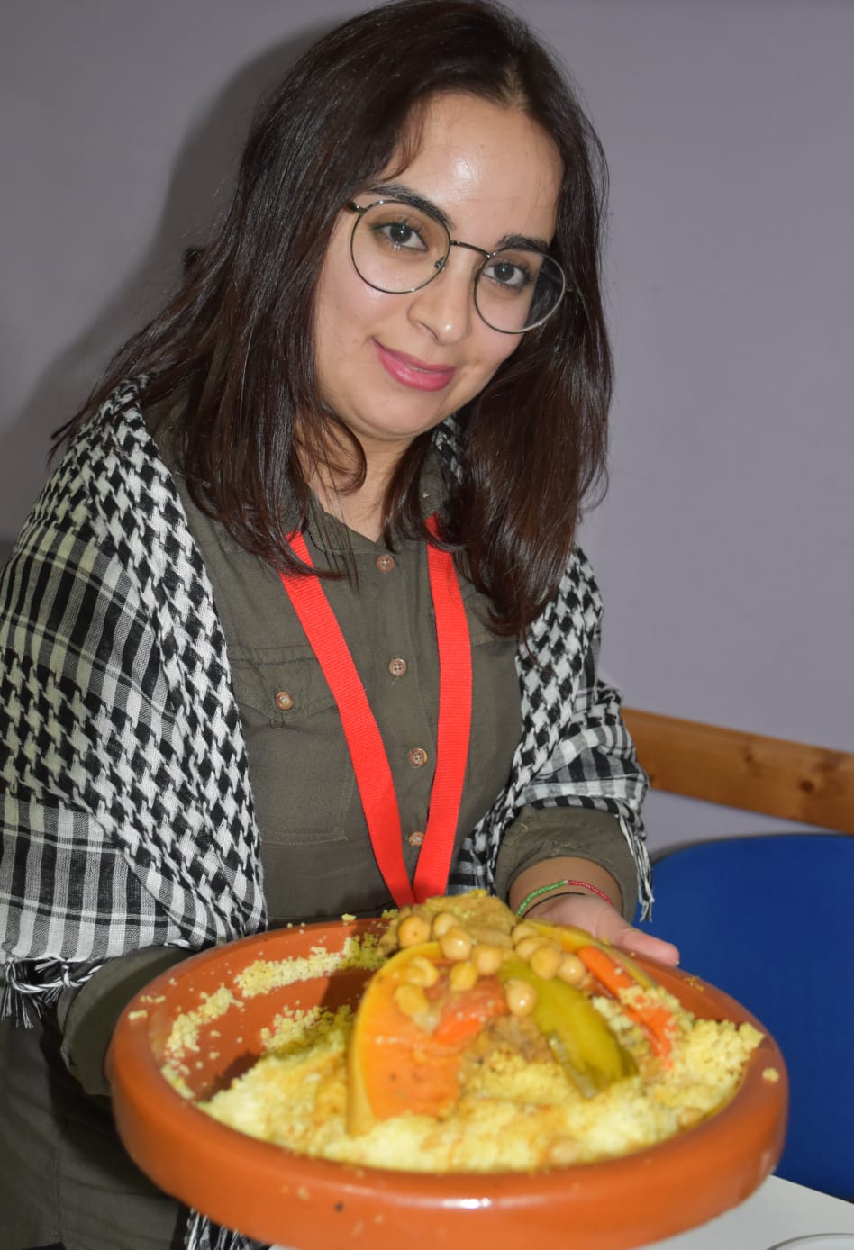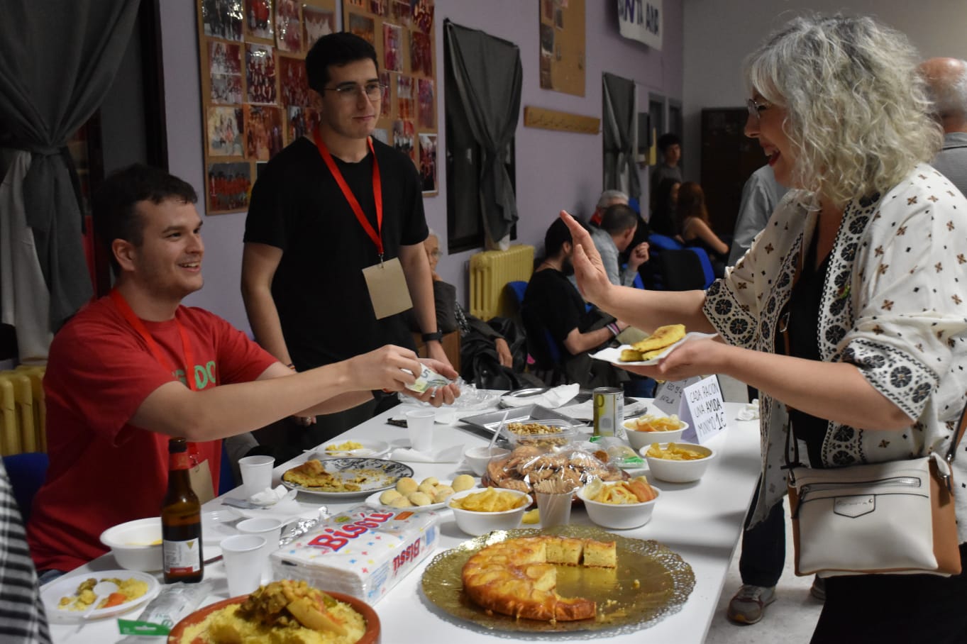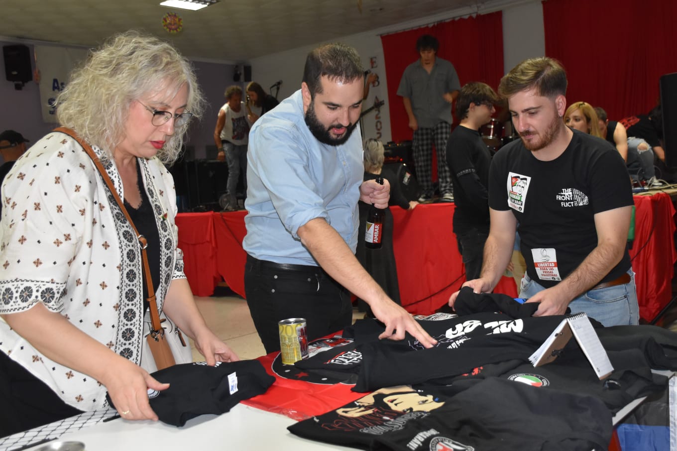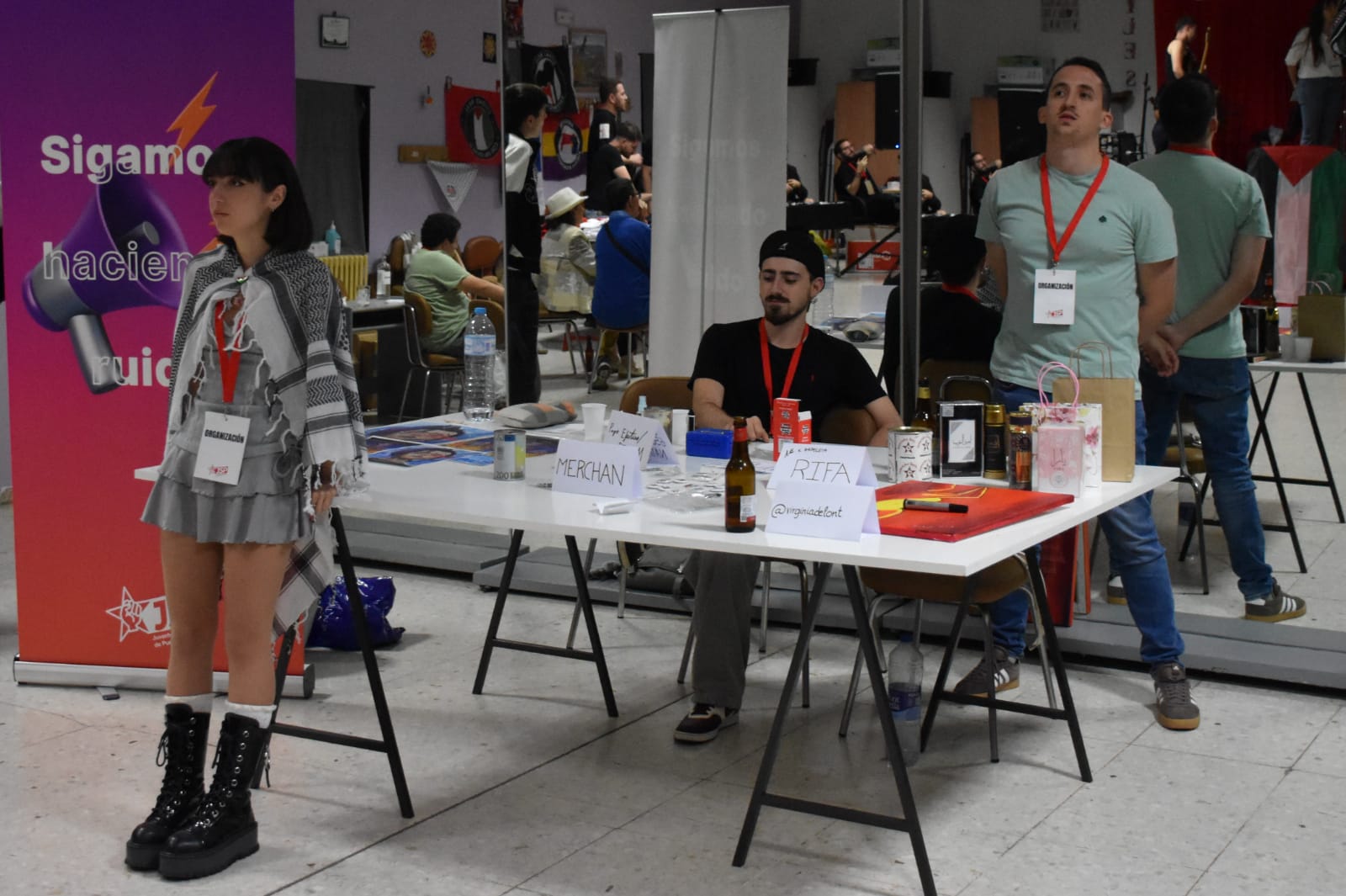 Mientras el público disfrutaba de las actuaciones artísticas, había repartidas por la sala distintas mesas donde podían comprar merchandising como chapas, pines, banderas, sudaderas, camisetas, las obras donadas de Virginia Delont, láminas de arte digital del artista @markomicss, agendas, kufiyas, pegatinas, cuadernos, papeletas para una rifa solidaria cuyo primer premio era una prenda de diseño y confección artesanal donada por @bestia_insaciable e incluso hacer una pequeña degustación de comida tradicional marroquí a cambio de un donativo voluntario.