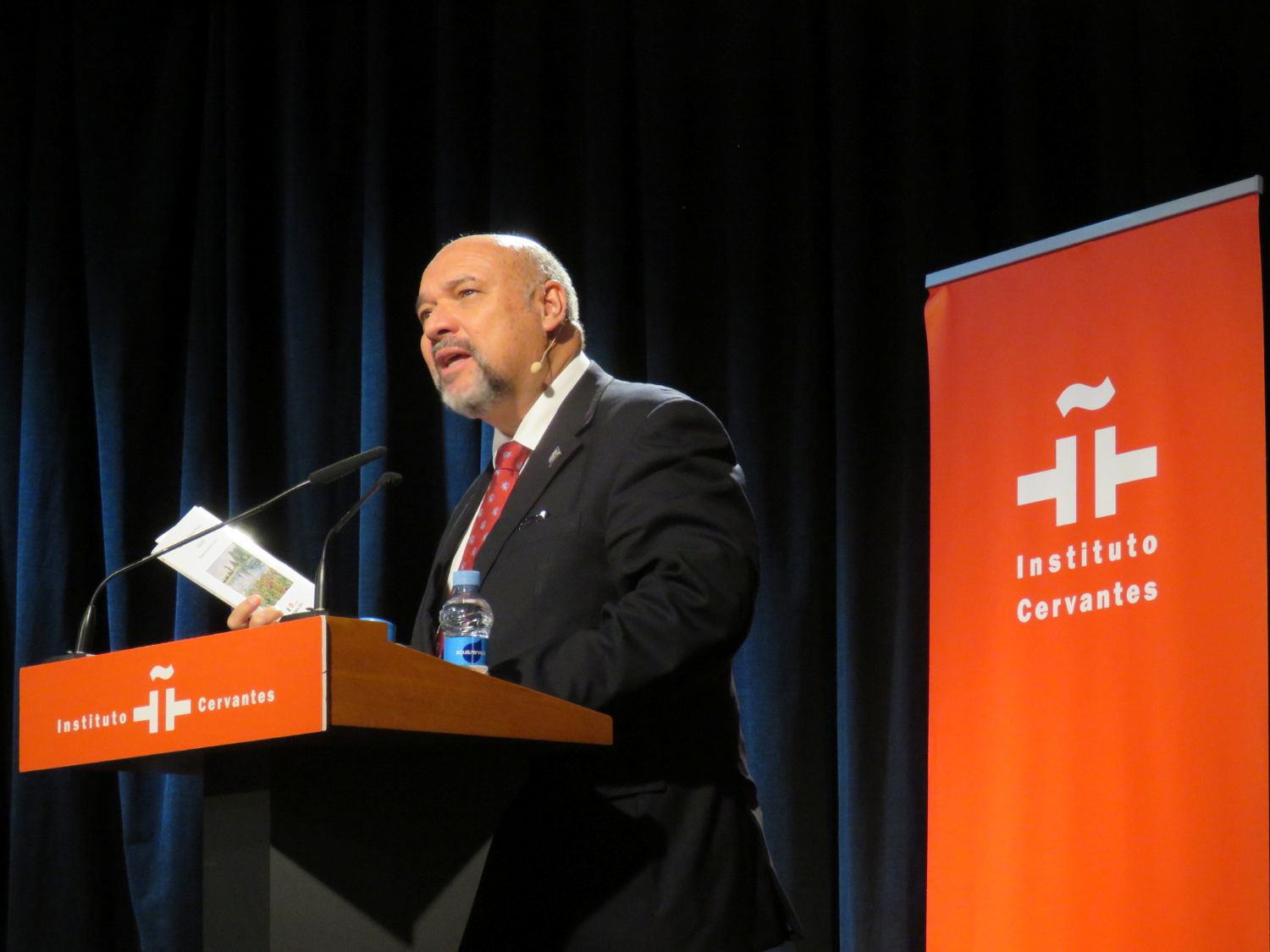 Foto 3: El director del Instituto Cervantes, Luis García Montero, no pudo asistir e intervino por videoconferencia leyendo un poema del libro presentado
