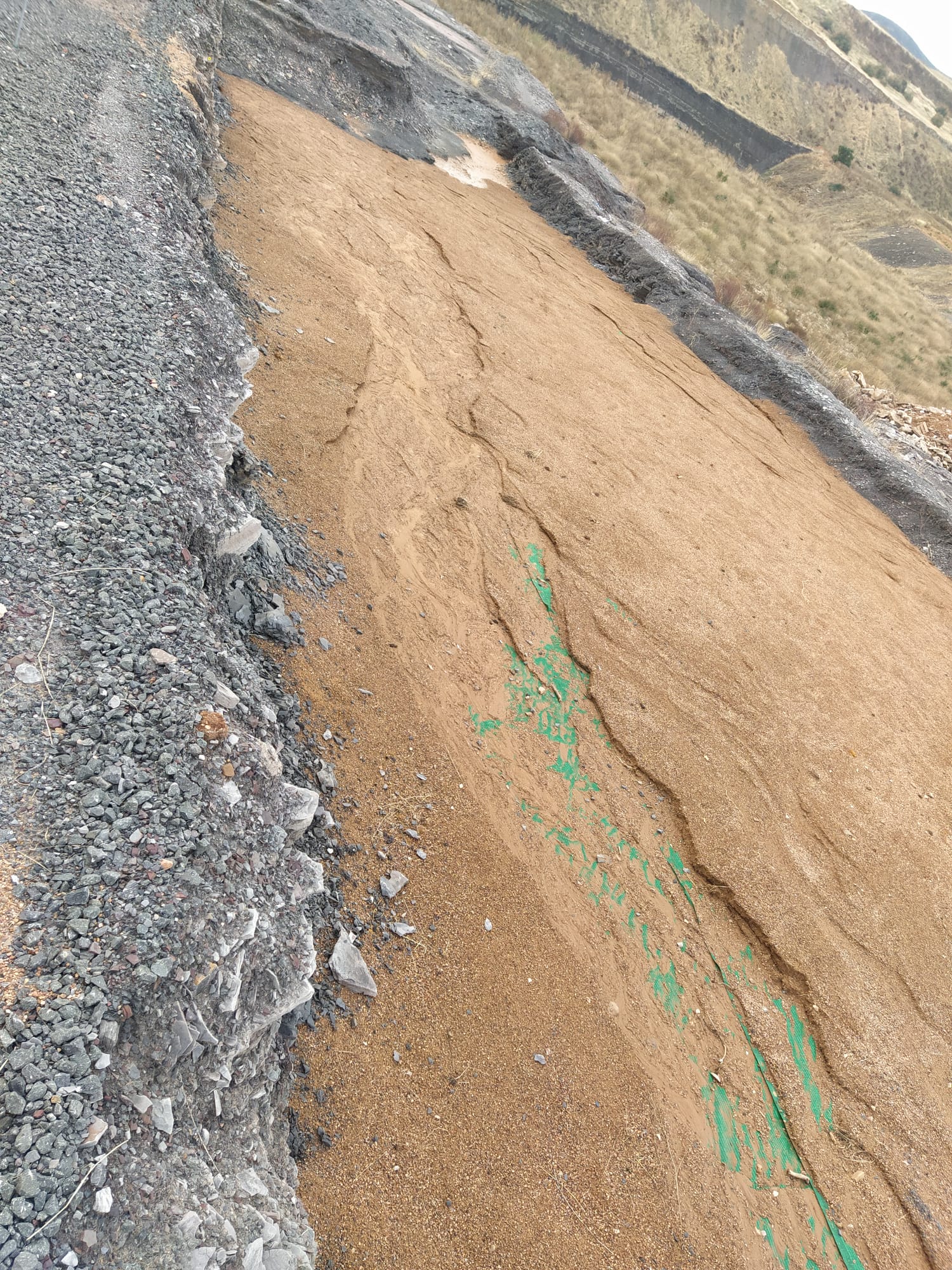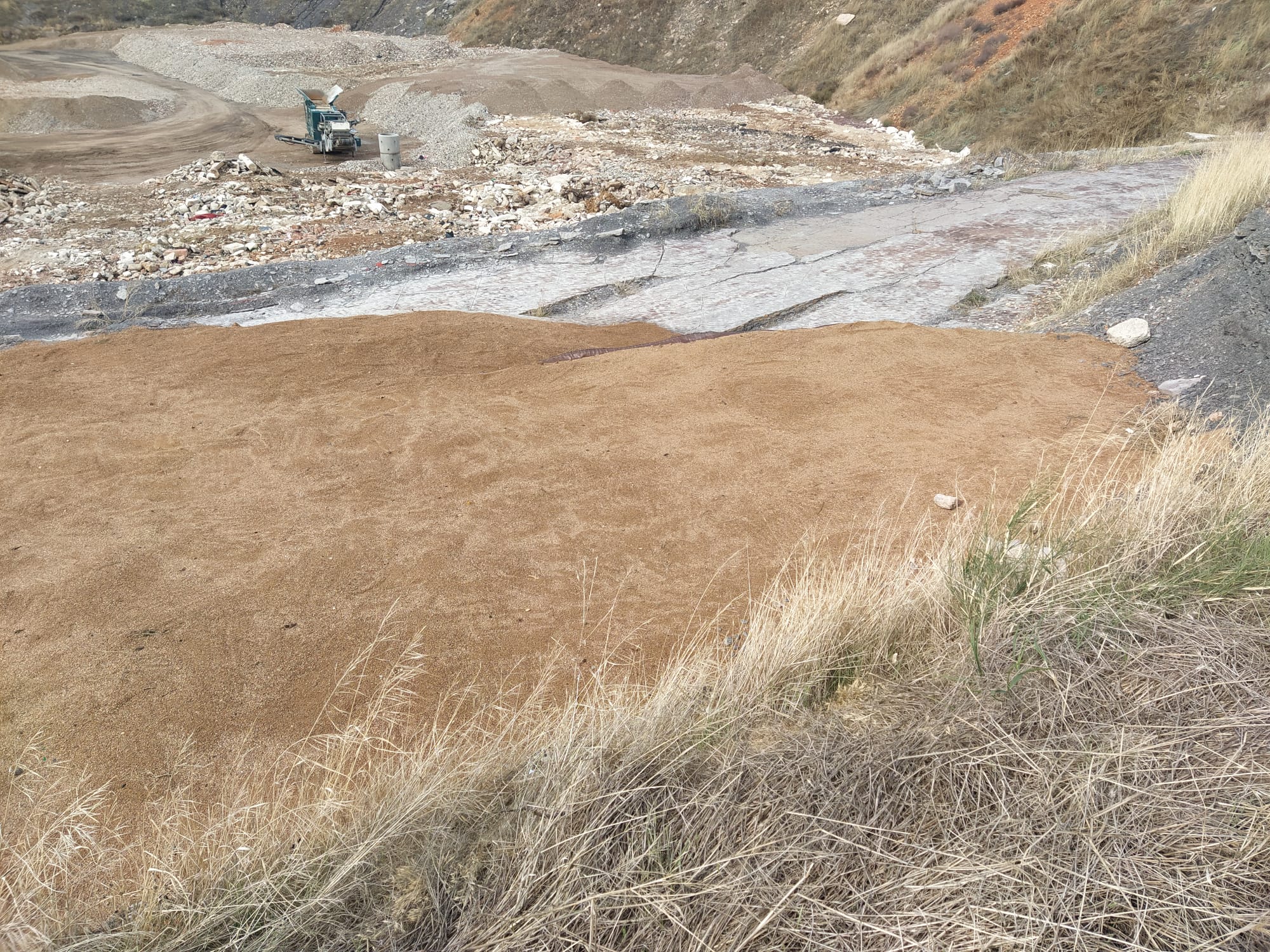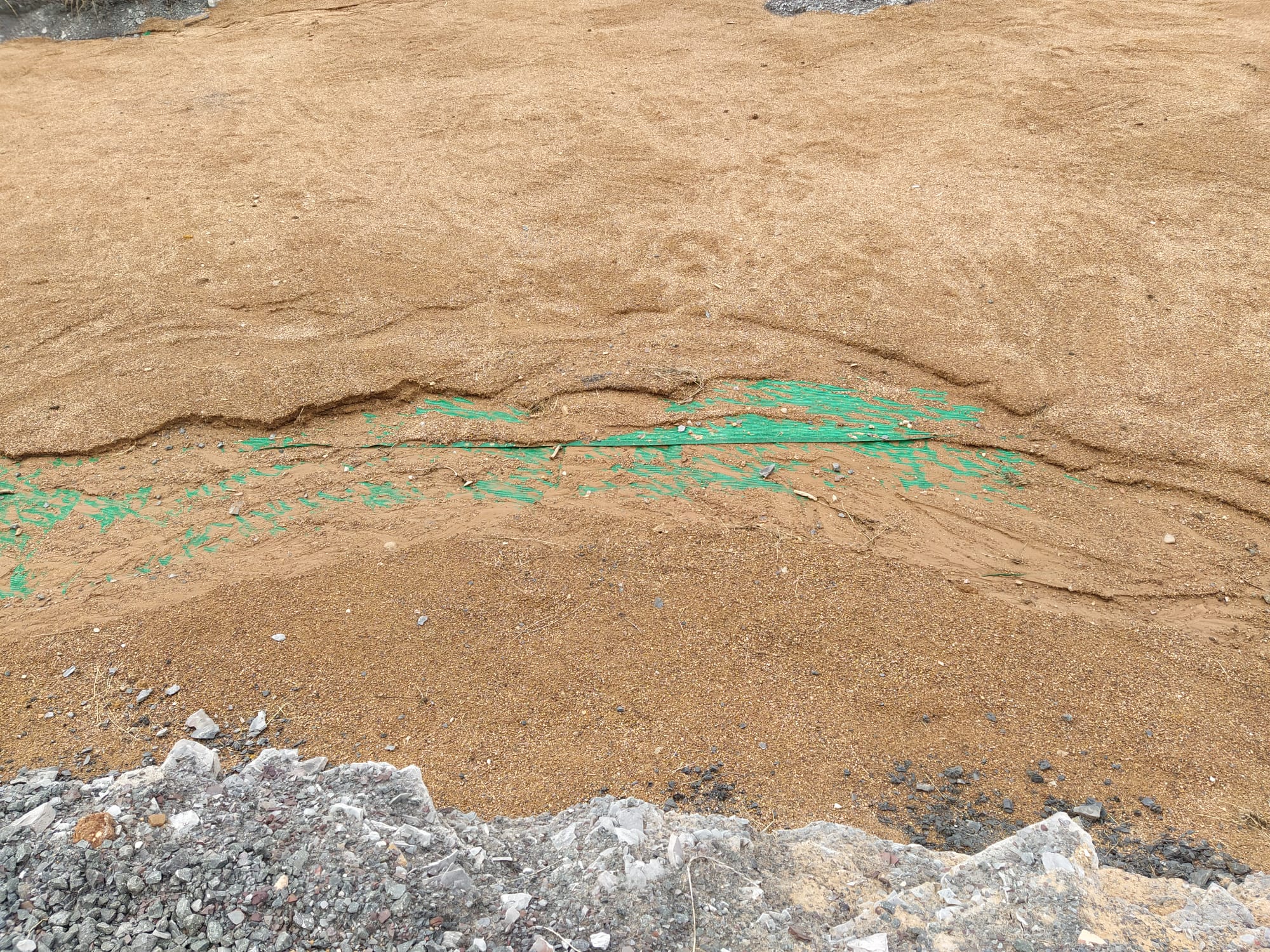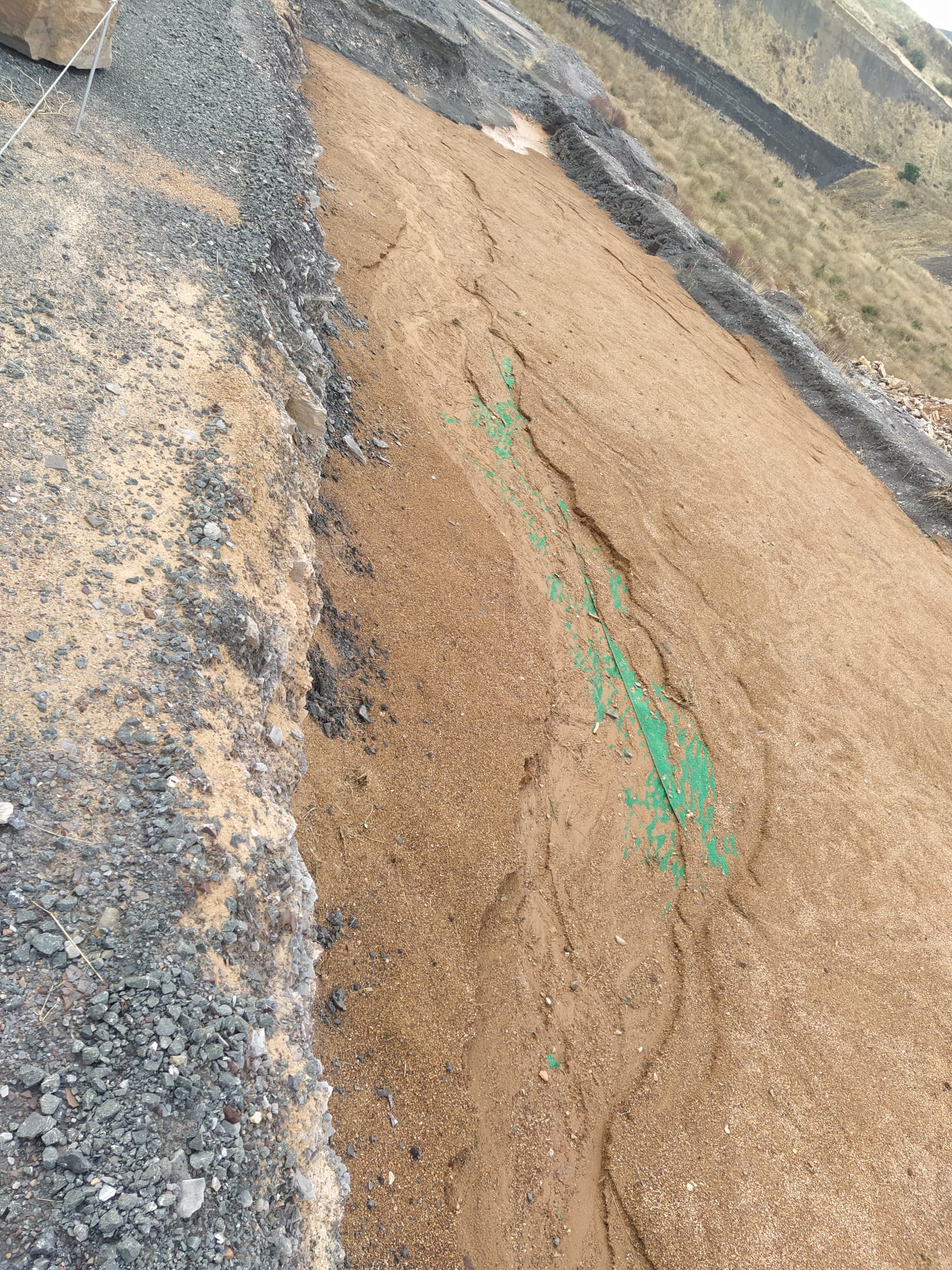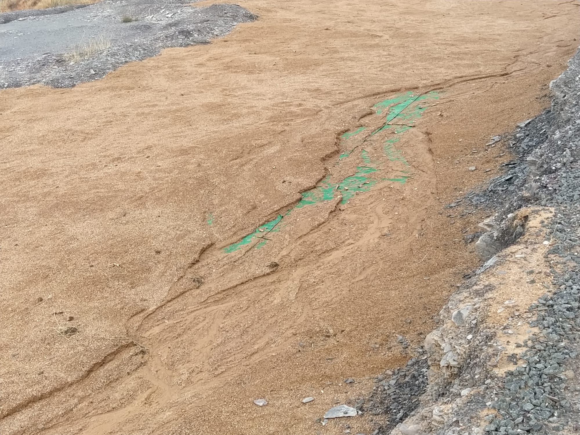 «Como era de esperar y con las pendientes que presenta la superficie se han producido unas mini torrenteras que han llevado una parte de esas arenas a los puntos bajos del yacimiento dejando al descubierto en varias zonas el geotextil verde y esto con apenas un día y medio de lluvias no excesivamente abundantes.