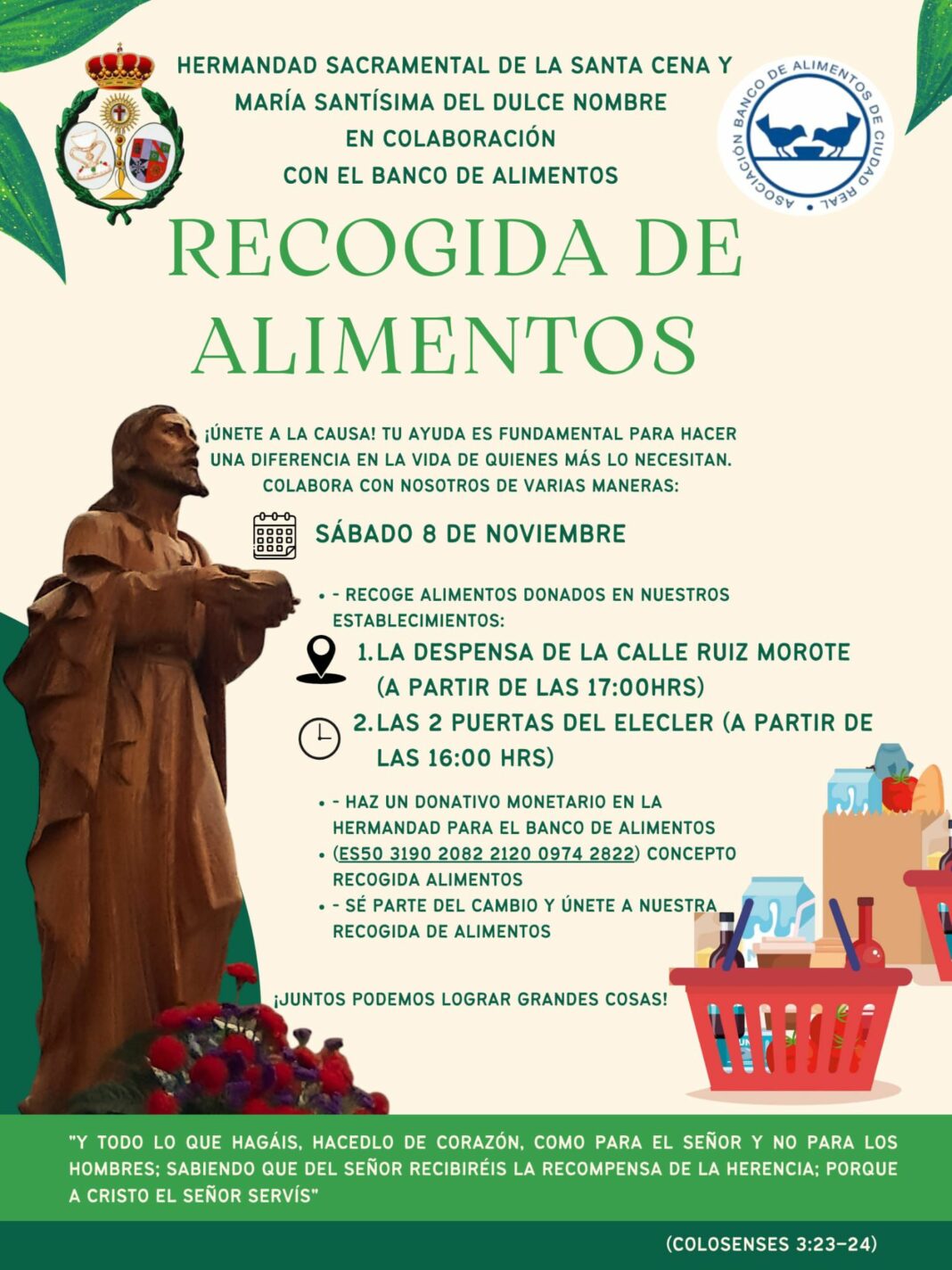 Eduardo Muñoz Martínez.- La Hermandad Sacramental de la Santa Cena y María Santísima del Dulce Nombre en colaboración con el Banco de Alimentos, realizarán el sábado, día 8, una recogida de alimentos, y por ello nos piden que nos unamos a la causa, porque nuestra ayuda es fundamental para hacer una diferencia en la vida de quienes más lo necesitan, advirtiendo que se puede colaborar de distintas formas.