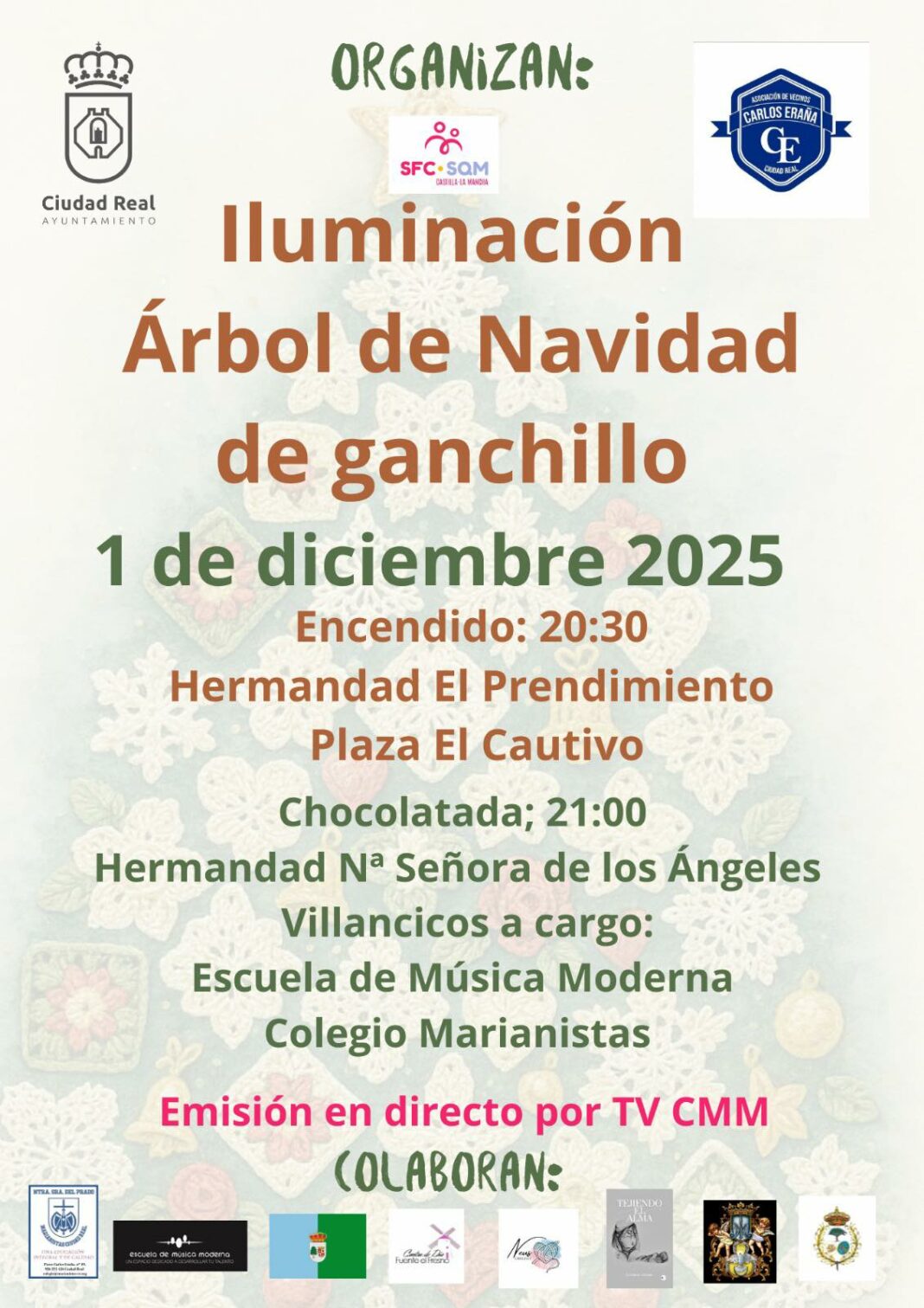 El próximo 1 de diciembre a las 20:30 horas en la plaza El Cautivo se procederá al encendido del árbol de Navidad de ganchillo del barrio de Los Ángeles a cargo de la Hermandad del Prendimiento. A continuación, habrá una chocolatada, a partir de las 21:00 horas.