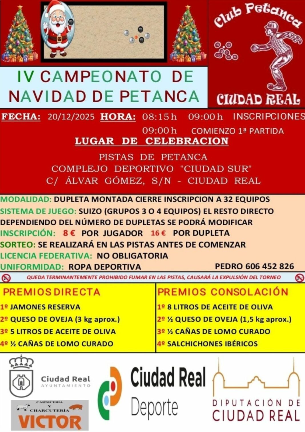 El próximo 20 de diciembre de 2025, el Club Petanca Ciudad Real celebrará su ya tradicional IV Campeonato de Navidad de Petanca, una cita deportiva que reunirá a jugadores y aficionados en el Complejo Deportivo “Ciudad Sur”, situado en la calle Álvar Gómez, s/n, de Ciudad Real.