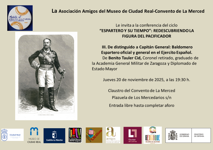 La Asociación Amigos del Museo de Ciudad Real–Convento de La Merced ha organizado para el próximo jueves 20 de noviembre de 2025, a las 19:30 horas, una nueva ponencia, la tercera, del ciclo “Espartero y su tiempo: redescubriendo la figura del pacificador”.