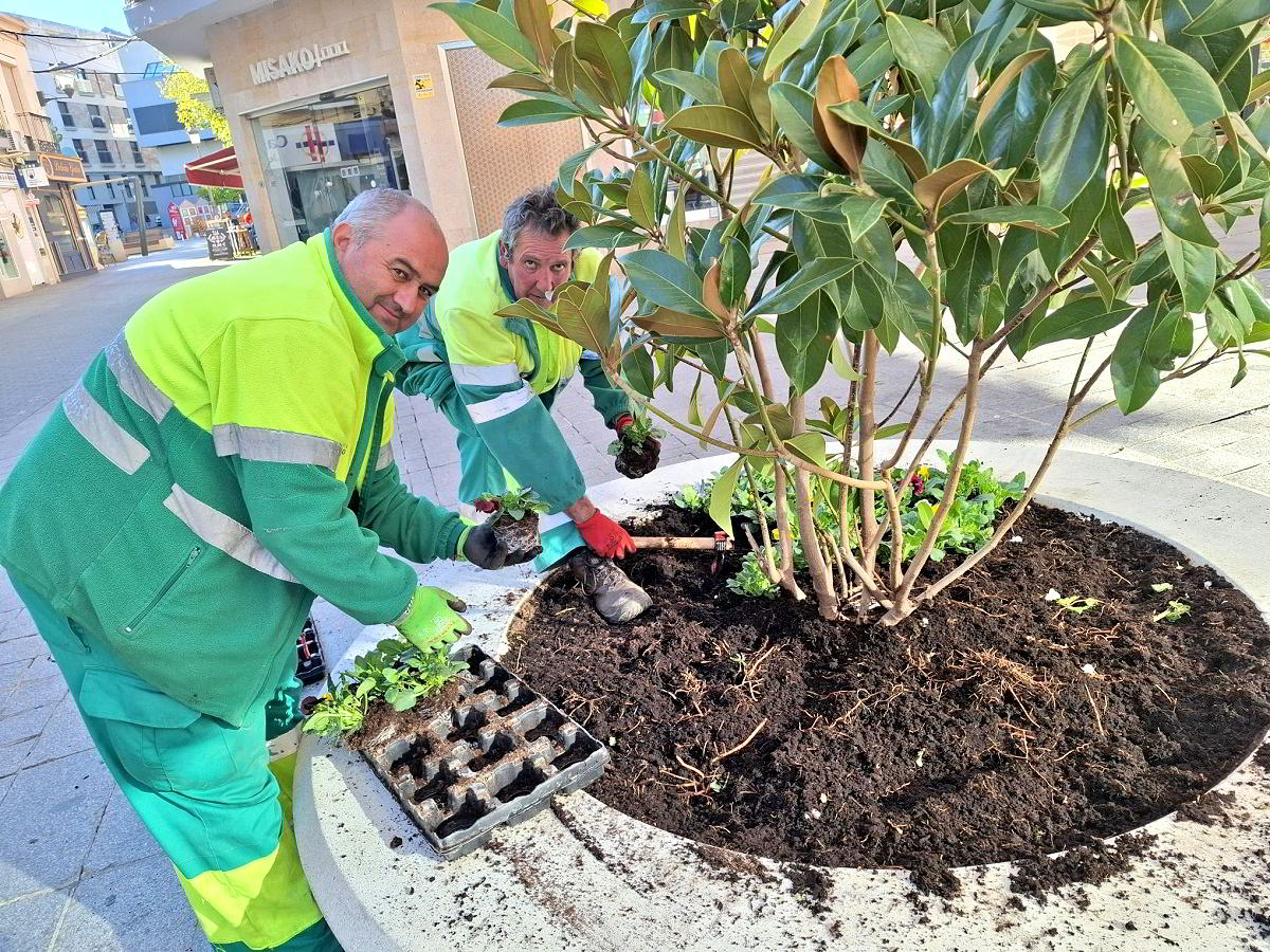 Trabajadores municipales del servicio de parques y jardines han revitalizado los grandes maceteros de la calle Aduana con la plantación de 4.000 pensamientos, 3.000 crisantemos, 3.000 cyclamen y 2.000 boca de dragón. Unas labores que se extenderán a la Concha de la Música, reloj de flores, parque de la Rincona y al entorno del Museo de la Minería.