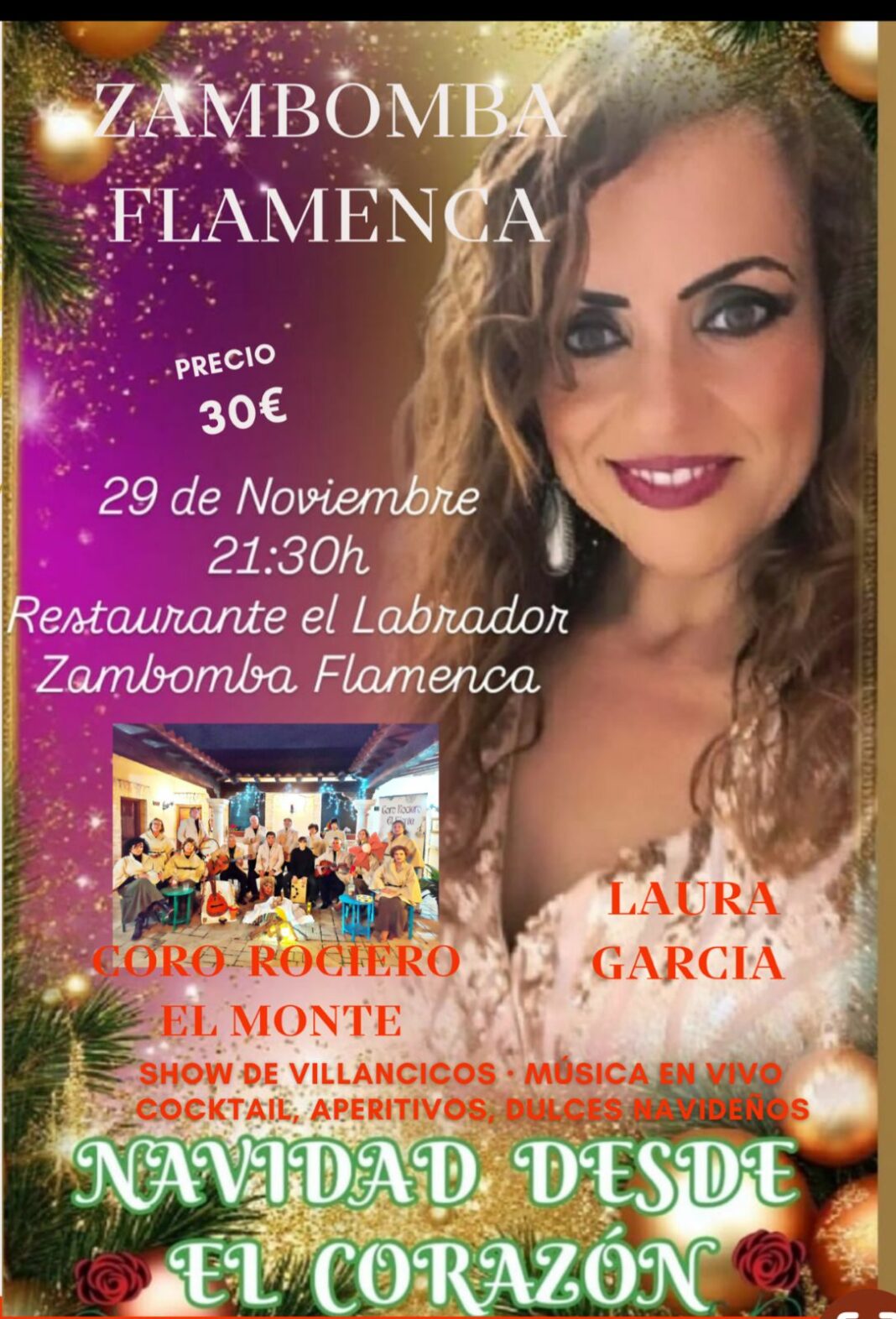 A ritmo de «Zambomba Flamenca» el Restaurante «El Labrador», de nuestra capital, – en la Carretera de Las Casas -, acogerá la gala, a partir de las 21:30 horas, en un ambiente de celebración y de pórtico de las Fiestas de Navidad, ya que mientras disfrutemos de la velada, podremos saborear algún cocktail, aperitivos, dulces navideños…, y todo por solamente 30 euros.