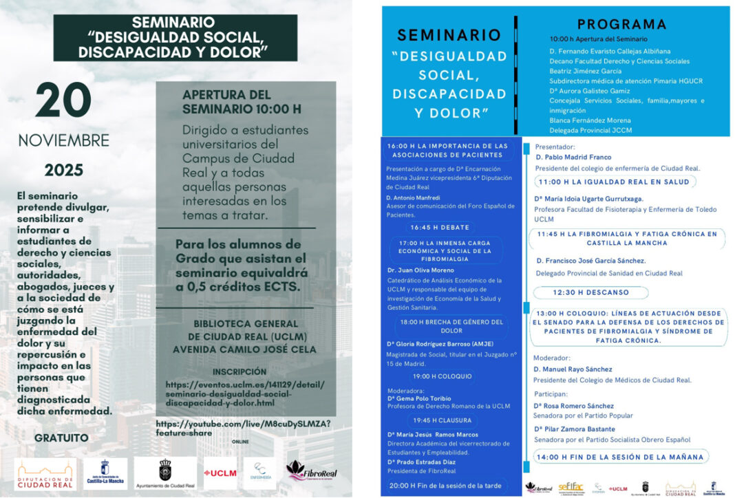 El seminario “Desigualdad social, discapacidad y dolor”, tendrá lugar el día 20 de noviembre en la Biblioteca general de Ciudad Real (UCLM), en la Avenida José Cela.