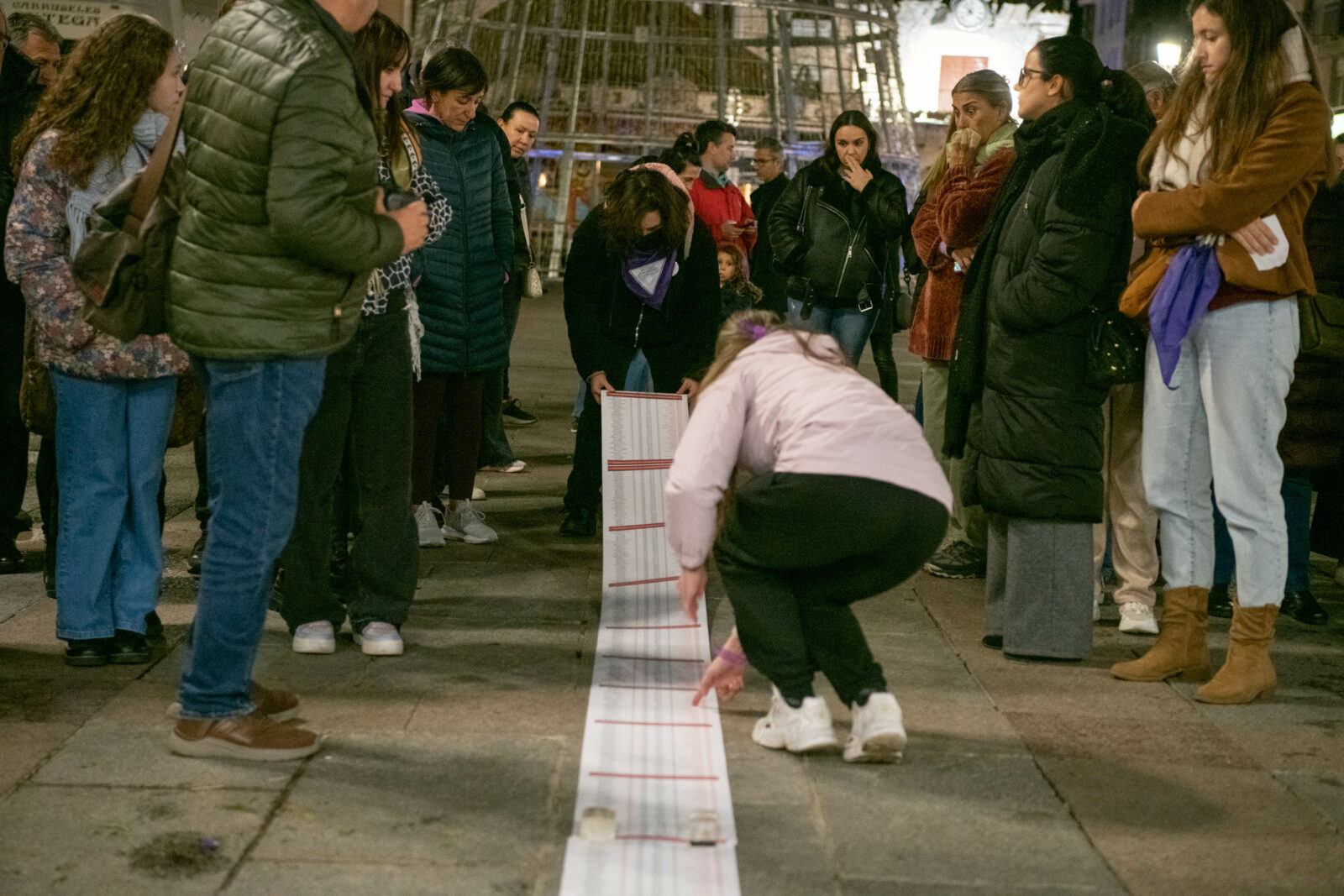 Al inicio del acto se ha dado lectura a los nombres de las mujeres víctimas de violencia machista y las circunstancias de su asesinato. Por cada una de ellas, como homenaje, las asistentes han depositado una vela encendida y un ramillete de siemprevivas sobre el suelo de la plaza. A continuación, se ha desplegado un rollo de papel continuo con los nombres impresos de las 1.334 mujeres asesinadas desde que existen datos oficiales. Un gesto con el que se ha querido visibilizar la magnitud de esta tragedia. La concentración ha finalizado con la lectura del manifiesto del colectivo convocante.