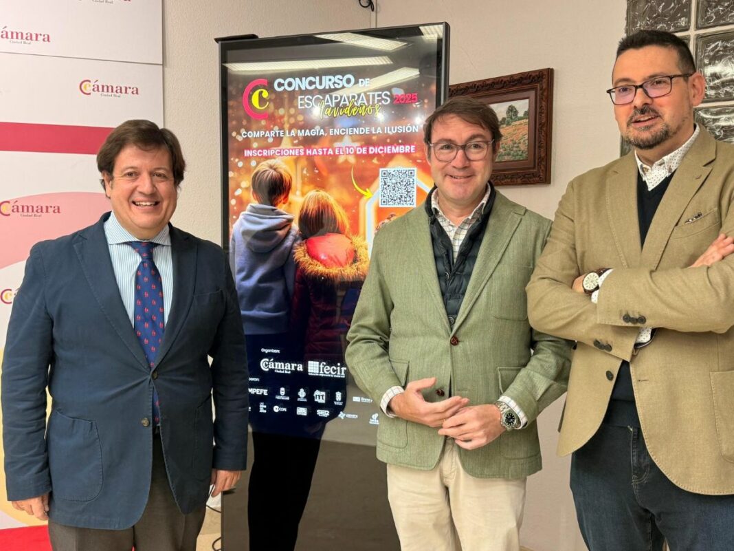 La Cámara de Comercio de Ciudad Real y Fecir han presentado este viernes la vigésima primera edición del Concurso de Escaparates Navideños bajo el lema “Comparte la Magia, enciende la ilusión”, una iniciativa que vuelve a ponerse en marcha un año más con el objetivo de dinamizar el comercio local durante la Navidad y llenar de luz y creatividad las calles de toda la provincia. En la rueda de prensa han intervenido el presidente de la Cámara de Comercio, José Luis Ruiz; el secretario general de Fecir, David Plaza; y el responsable de instituciones de Globalcaja, Gundemaro Sobrino.